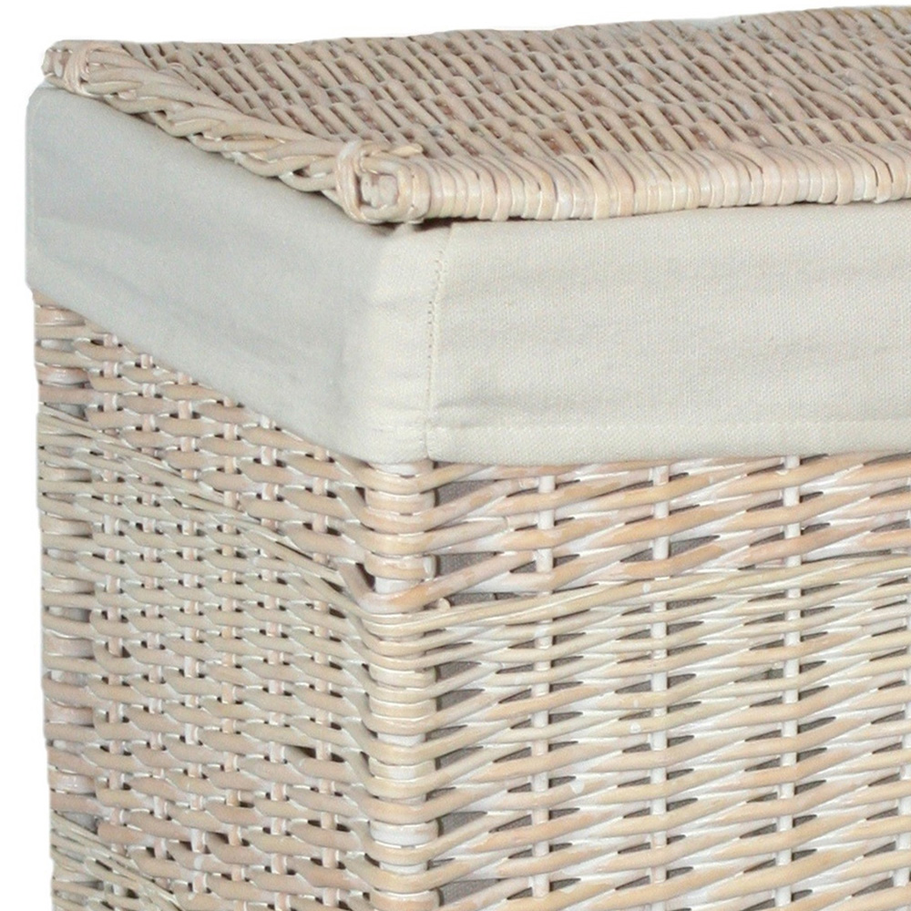 The Red Hamper Small Square Laundry Basket is crafted with a full white wash finish willow and features white faux leather accents. It also includes a removable cotton lining and convenient integral handles. This laundry basket is of high quality and is well-made with excellent craftsmanship.