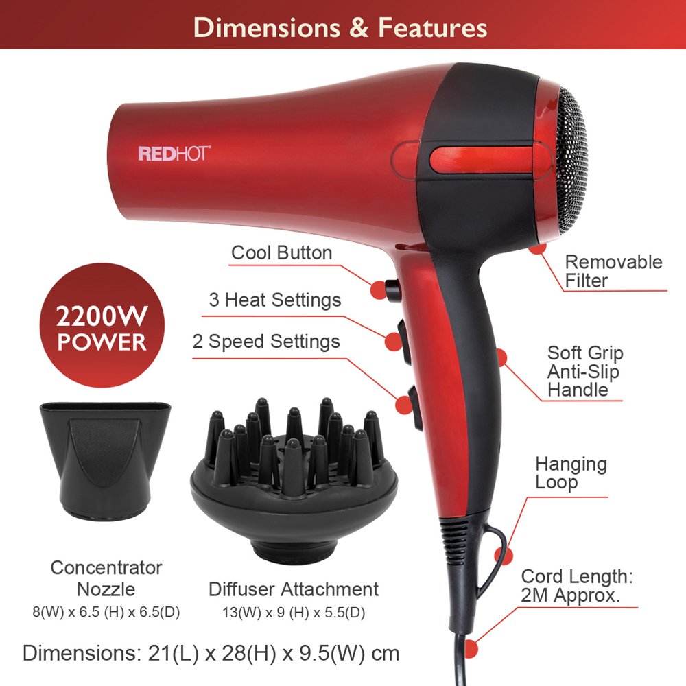 The Red Hot Red Professional Hair Dryer with Diffuser is a stunning hair dryer that offers fast and efficient hair styling in two different styles. Whether you're going out on the town or having dinner with friends and family, this hair dryer has got you covered. It comes with a diffuser nozzle that is perfect for creating voluminous curls, as well as an adjustable concentrator nozzle that works well with all hair types, including straight, curly, thin, and thick hair. With three individual heat settings and two-speed settings, you can style your hair in a variety of ways. Additionally, the cool air function allows you to dry your hair without exposing it to excessive heat. This portable hair dryer also features a 1.6-meter power cable, allowing you to comfortably style your hair in front of a mirror without being restricted by the location of the plug socket. Furthermore, it includes a safety hanging loop, allowing you to safely store the hair dryer after use. With its compact size of 22.5 x 10 x 27cm, this professional hair dryer is a must-have for anyone looking to achieve salon-quality results at home.