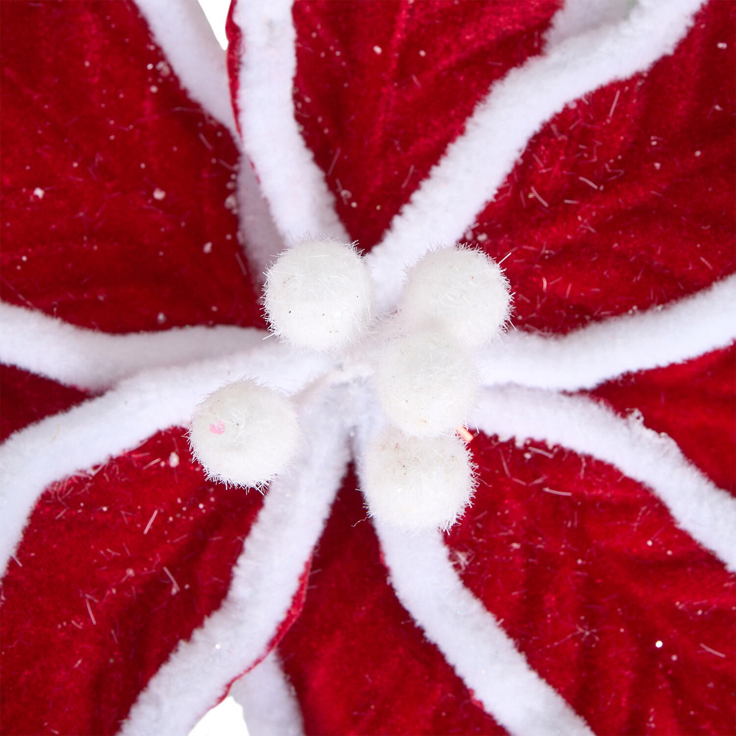 Brighten your Christmas decor with the Red and White Flower Pick. This pick showcases detailed petals with white borders that stand out beautifully in any home. Whether you use it as a standalone piece to adorn your vase or pair it with other floral arrangements to create a lovely display, it's sure to be the perfect finishing touch to your festivities.