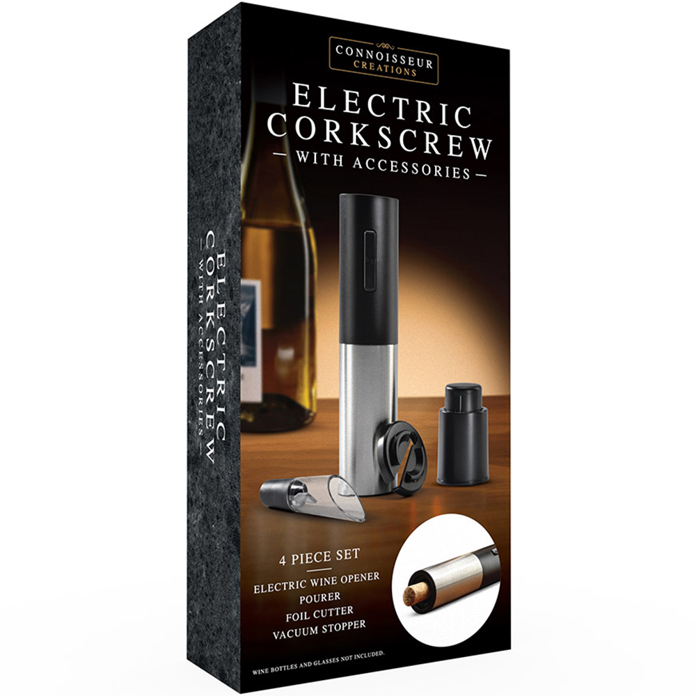 Upgrade your wine experience with the Connoisseur Creations Electric Corkscrew Set. This 4-piece set opens bottles in just 11 seconds, and includes a pourer for mess-free serving, a foil cutter, and a vacuum stopper for preserving your wine. Rechargeable and easy to use, it's the perfect tool for wine lovers who appreciate convenience and style. (Not dishwasher safe.)