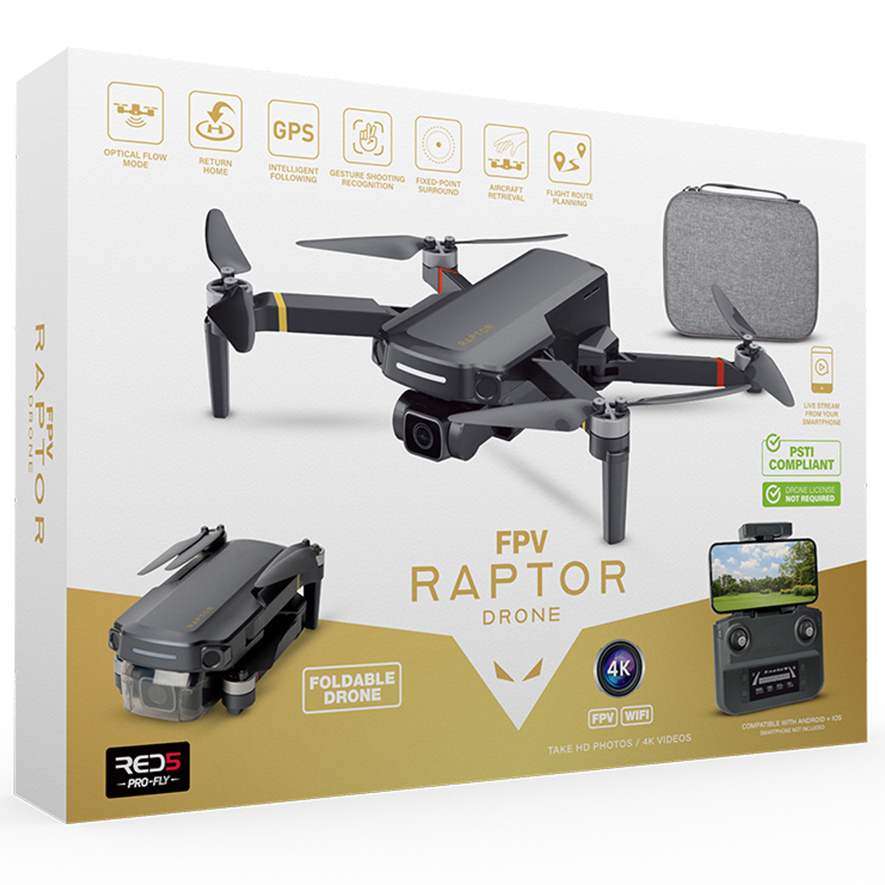 The Red5 Raptor Drone offers a remarkable 800-meter control range and up to 20 minutes of flight time. Capture stunning 4K photos and 720p video, streamed via 5G Wi-Fi. Featuring intelligent GPS functions, one-click return-to-home, gesture shooting, and stable hovering with optical flow vision, it ensures safe and creative flights for both beginners and pros.