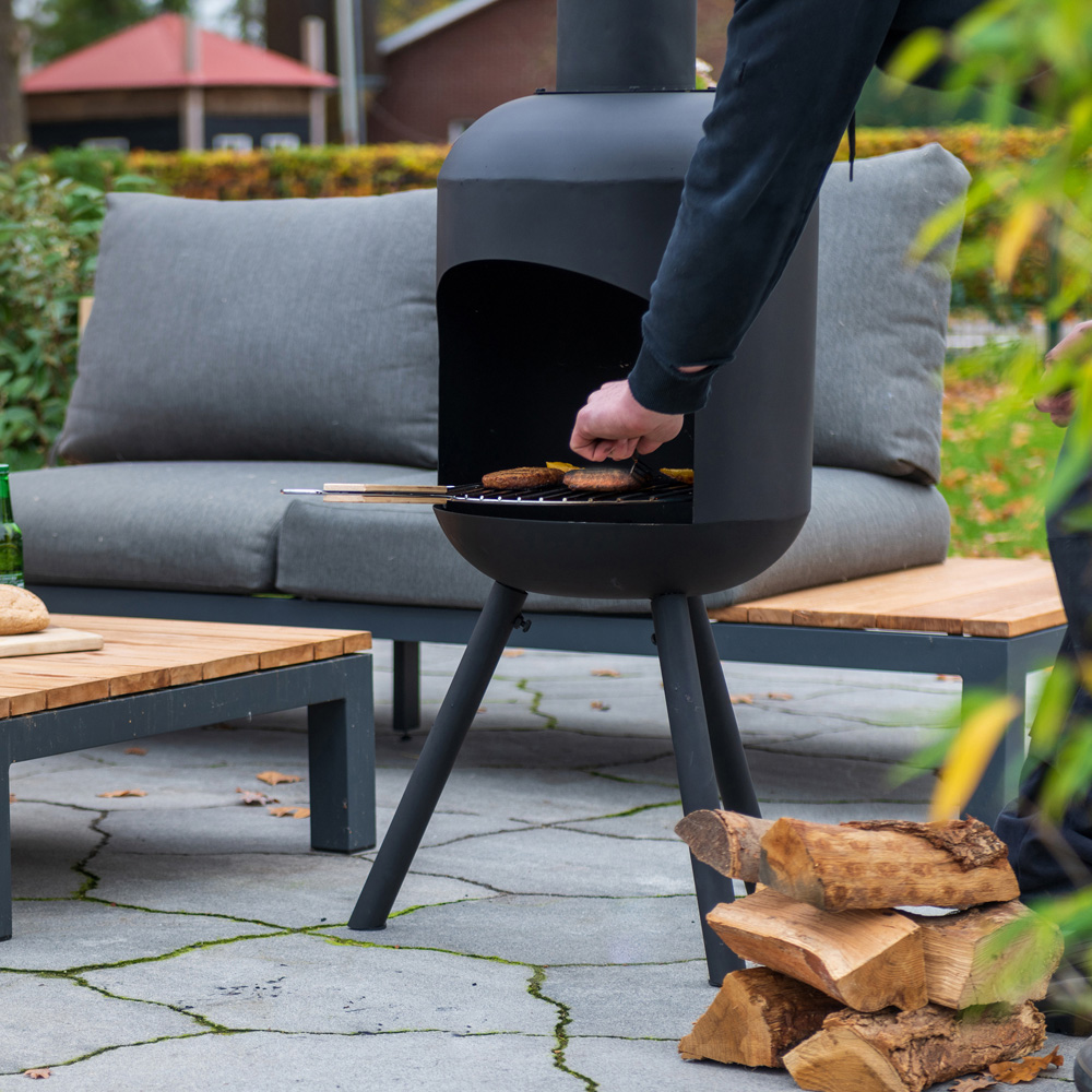 This spacious timeless patio fireplace from the RedFire range has a multifunctional character. Made from durable steel and painted in a matt black high-temperature resistant paint, this chimenea is durable and sturdy. With its large size, you can easily use larger pieces of wood. This fireplace from RedFire is therefore ideal for larger spaces and gives a lot of heat, partly due to the conductive metal. With its matte black look, the patio fireplace has a timeless modern look and is a beautiful addition to any style garden or terrace. In addition to the function of a garden fireplace, the Fuego Large also holds its own when it comes to barbecuing. This RedFire chimenea comes with a grill. This grill is safe to operate, due to the long handle. This way you can easily take the grill out of or above the heating area. The grill is approx. 40 centimetres in diameter, so there is enough space to prepare your meat, veggie or fish dish. Installation is easy. Screw the chimney onto the firing area and easily mount the 3 legs underneath. A heat-resistant chimney neatly removes the smoke and gives the modern look an extra touch. The three sturdy legs ensure a stable position, so it is unlikely that the Fuego will fall over quickly. That way you are provided with warmth and taste in no time. Enough ingredients for a pleasant evening! To enjoy the firebox for a long time, you can clean the frame, lid and bottom plate the next day or after cooling down sufficiently to prevent too rapid wear. The type of storage can also affect the durability of the Fuego, as the more the material is exposed to the weather, the sooner it can cause rust and other signs of use. With a protective cover, make sure that the patio fireplace remains in optimal condition for your garden for even longer.