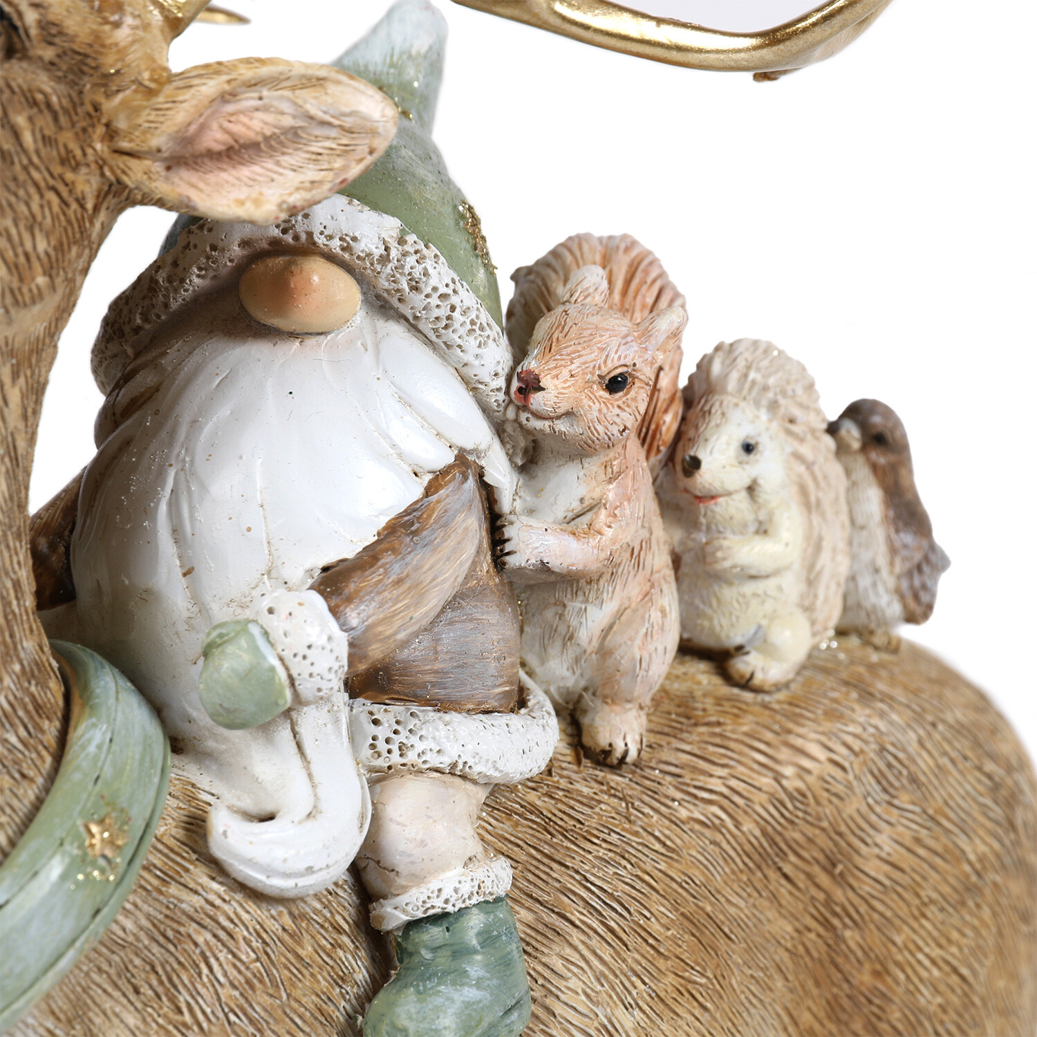 This Reindeer & Friends Ornament will be the ideal finishing touch to your home this Christmas. Perfect for those who prefer a rustic element to their Christmas decorations, this festive decoration is crafted to look like a reindeer with a Gonk, a squirrel, a hedgehog, and a bird all sitting on his back. The reindeer is finished with a sage green scarf and golden antlers for a rich, luxurious touch. This will look fantastic on display on accent tables, shelves, and mantelpieces anywhere in your space.