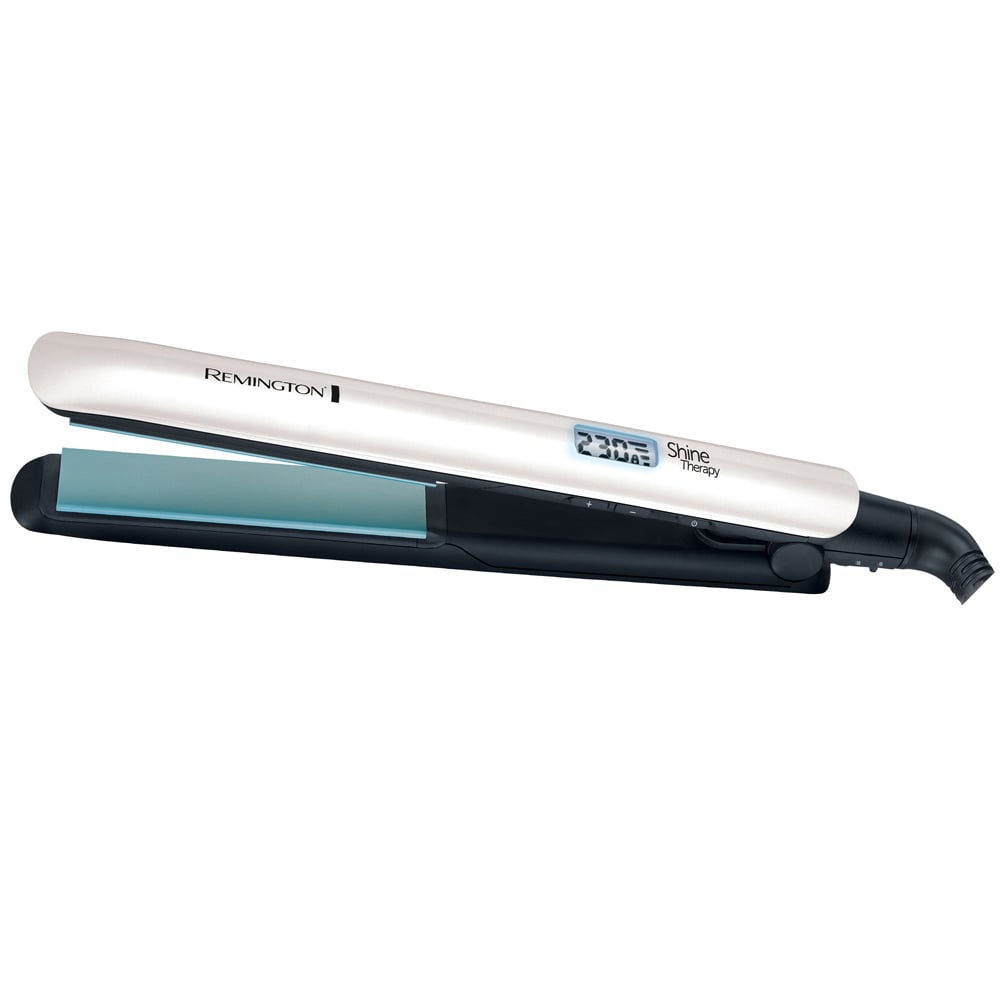 Achieve salon-style hair at home with the Remington Shine Therapy Hair Straightener. This ceramic plate hair straightener has advanced Ceramic coated plates infused with Moroccan Argan Oil that provide 86% more shine. It heats up in just 15 seconds and can go up to 230 degrees with 9 temperature settings and a Turbo boost function. It has floating plates that make it versatile, allowing many different hairstyles. The 2.5m swivel cord swivel cord adds to the convenience. An auto shut-off, plate lock and temperature lock function is included for optimum safety. The worldwide voltage and heat-resistant pouch make it extremely travel-friendly.