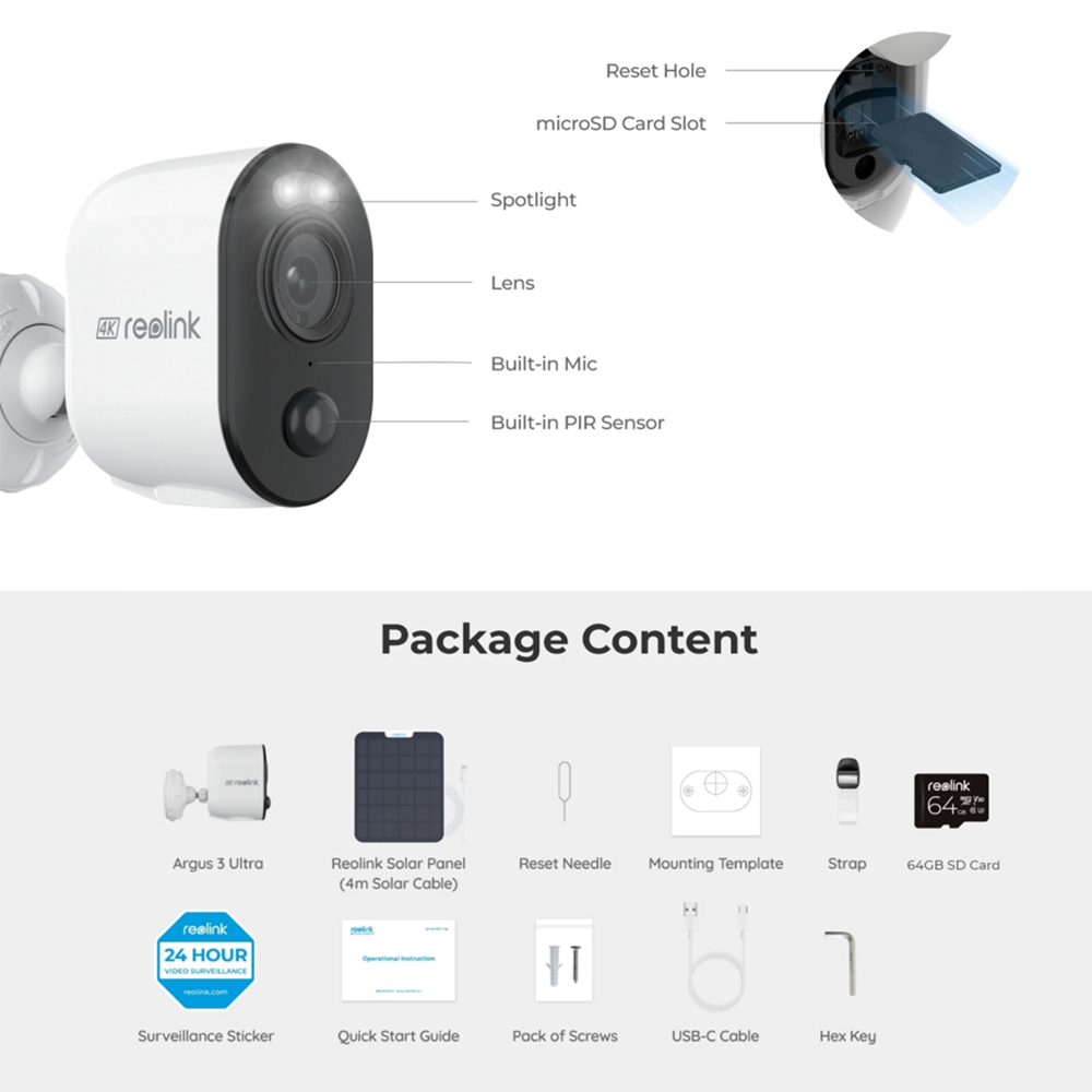 Keep your home and business safe with this Reolink Argus 3 Pro 4K Spotlight Camera. It features night vision and a spotlight that provides 24/7 clarity to allow you to see details. This camera offers 4K ultra HD resolution to give clear and sharp videos and images. Accurate and efficient, it uses artificial intelligence-powered detections to distinguish between human, pet, and vehicle presence within the camera's view. It also allows you to view the footage in real time using the Reolink app. With the built-in two-way audio, communicate and deter any suspicious activity. Use this camera to keep your home safe.