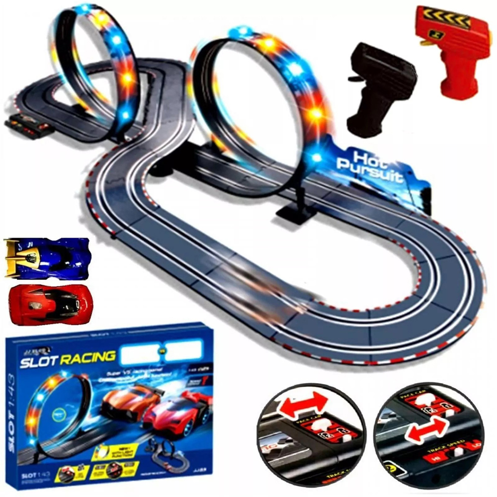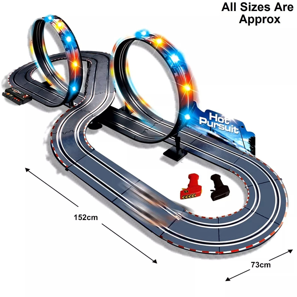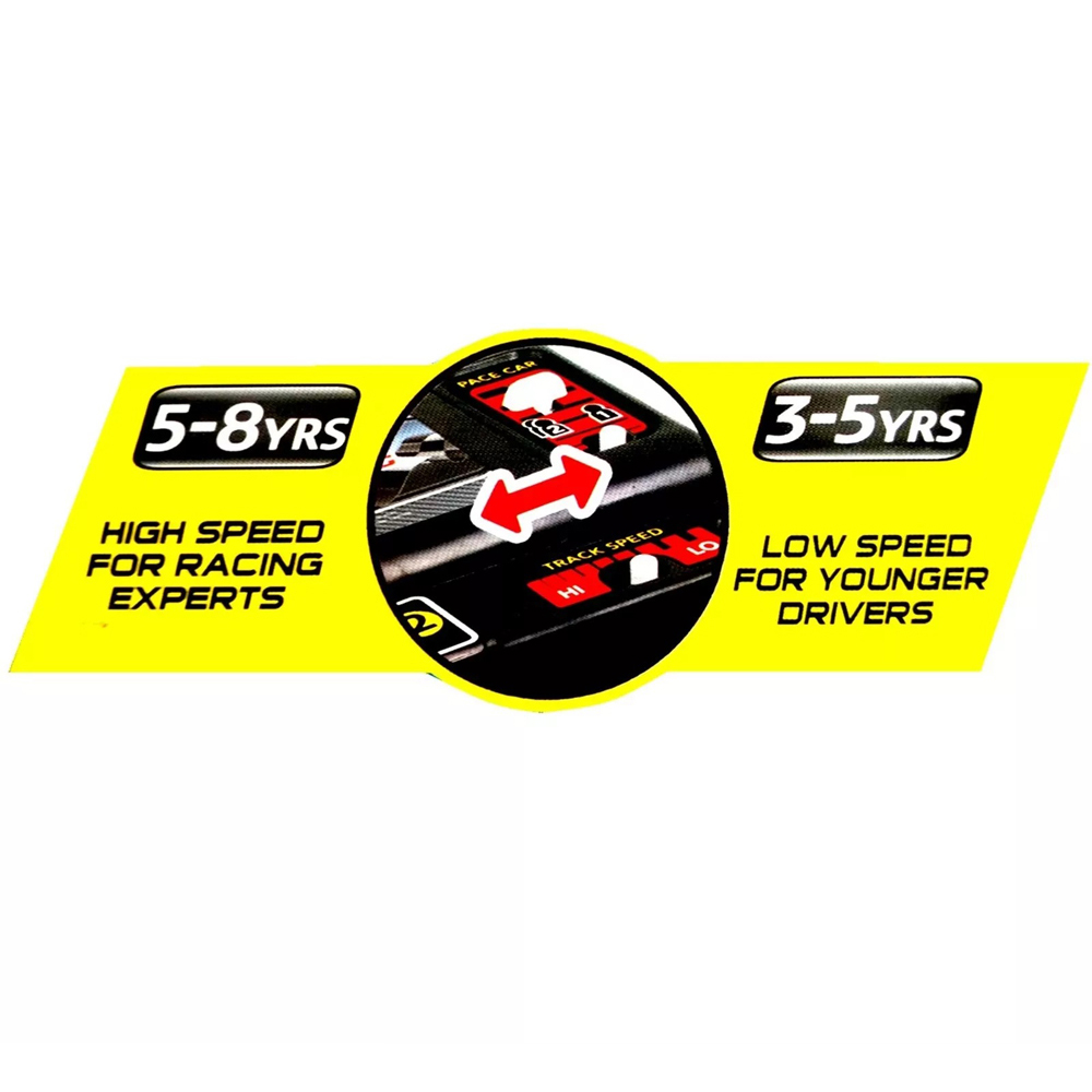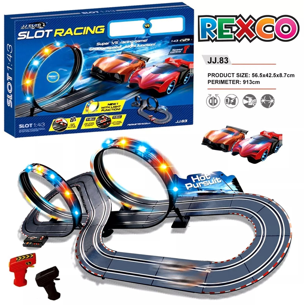 Rexco Large Electric Battery Operated Remote Control Light Up Slot Car Racing track Set Kids Toy Children's Game Gift JJ83-1. Ideal for the younger racer, 1:43 scale Slot Car Racing Set offers all the thrills and spills of the full-sized slot car racing world and is the perfect introduction to the action-packed world of Slot Car Racing . This new set features colourful and futuristic concept cars with exciting features including loop the loop and light up track! keeping the most demanding of junior racers entertained. The track has been designed for uncompromising velocity. Size Of Track: 152cm x 73cm Approx, Scale: 1:43, Perimeter: 500cm Approx, Speed Control: 3-5 Yrs Low speed for younger drivers, 5-8 Yrs High speed for racing experts, For 1 Or 2 Players, Track with light function, Requires 8 x 1.5V AA Size Batteries (Not Included), Includes 2 x Slot Cars, 2 x Controls.