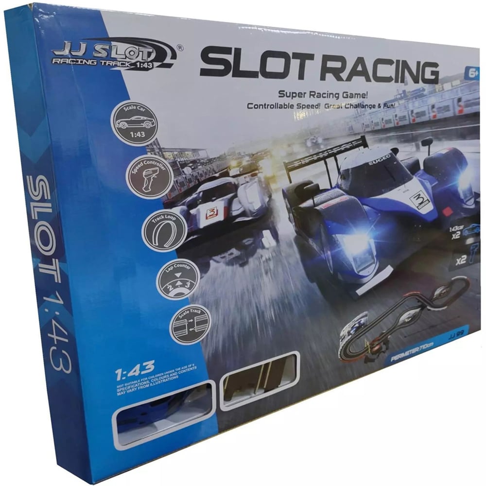 Rexco Large Electric Battery Operated Remote Control Slot Car Racing Track Set Children Kids Boys Toy Race Game Xmas Gift JJ99-1. Ideal for the younger racer, the 1:43 scale Slot Car Racing Set offers all the thrills and spills of the full-sized slot car racing world and is the perfect introduction to the action-packed world of Slot Car Racing. This new set features colourful and futuristic concept cars with exciting features and accessories, keeping the most demanding of junior racers entertained. The track has been designed for uncompromising velocity. Size Of Track: 210cm x 85cm Approx, Scale: 1:43, Perimeter: 710cm Approx, Requires 8 x 1.5V AA Size Batteries (Not Included), Includes 2 x Slot Cars, 2 x Controls, Features: Lap Counter= Make it even more competitive, Speed Controller= The driver to choose slow or fast speed, Not suitable for under 6 years of age.