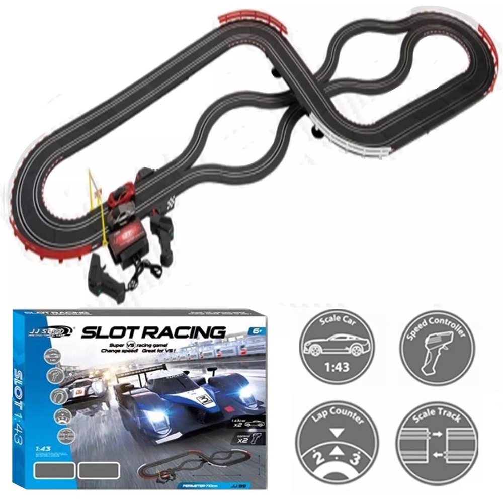 - Offers all thrills of full-sized slot car racing world