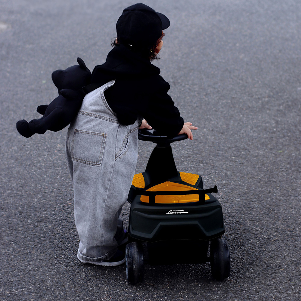 Lamborghini Swing Car Ride On Swivel Scooter is a ride-on toy for kids that allows them to move without pedals or gears. It functions by using a simple twisting action of the steering wheel, allowing the car to move forward through gravity and friction. Sit on the swing car with both feet on the footrests and your hands on the steering wheel. Continuously turn the wheel back and forth, and the swing car's innovative design will glide forward on its own using gravitational and centrifugal forces. To stop, simply cease turning the steering wheel, wait for the car to decelerate, and place your feet on the ground. To achieve greater speed, lean slightly forward over the steering wheel and engage your entire upper body while turning the steering wheel (not just your arms). Maximum speed on flat surfaces reaches 6mph, while normal use results in speeds of three to four miles per hour. Constructed from PP, ABS, nylon, and stainless steel fittings for the wheels and other moving components. No pedals, no motor! Requires three AA batteries for light and sound (not included) and performs best on flat surfaces. Appropriate for ages 36 months and up, with a maximum weight limit of 110 kg for the child. Dimensions: 78 x 32.5 x 35.5cm, Weight: approximately 3.9kg.