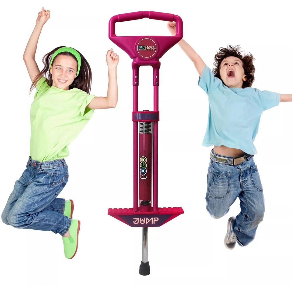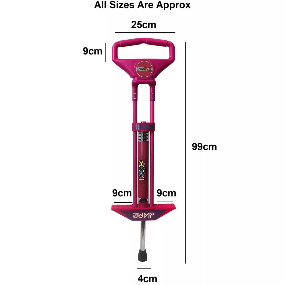 Rexco Kids Pogo Stick Jackhammer Stick Fun Spring Powered Jumping Bounce Jump Toy Indoor Outdoor Garden Camping Picnic Ride On Game. The cool Pink Pogo Stick by Rexco has a durable construction and incorporates a high-tech design. This robust pogo stick benefits from a super bounce, heavy-duty spring and non-slip foot grips and provides hours of safe bouncing fun for the kids. Children simply grab the handlebars, put their feet on the platform and get bouncing! The strong and robust coil spring centre is guaranteed to tire them out and keep them bouncing for hours! Size: 99cm Height x 28cm Width x 6ccm Depth Approx, Durable construction pogo stick with the high-tech design, Material: Steel And Plastic, Super bounce, Heavy-duty spring, Non-slip foot grips, Colours Available: Pink, Ages 5+.