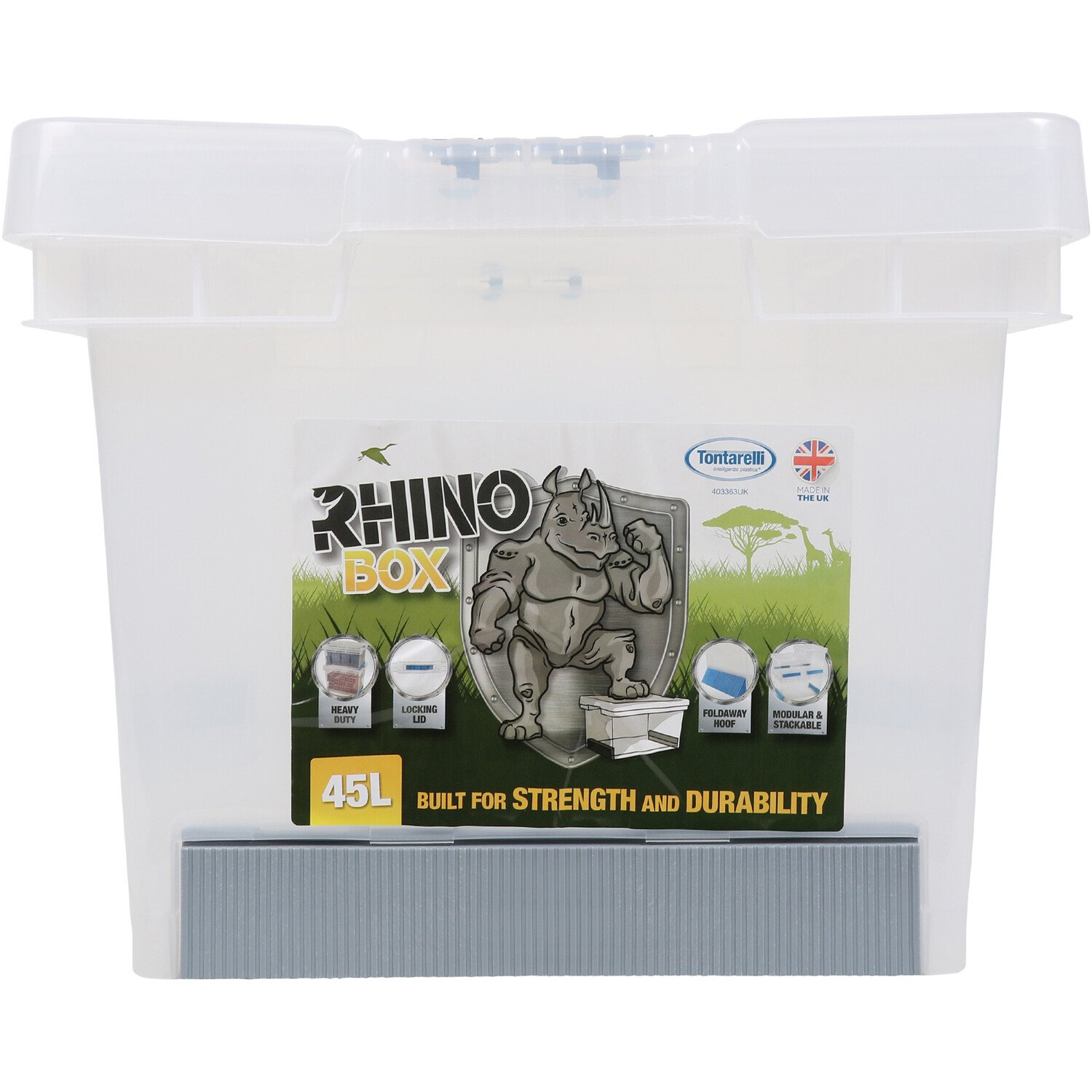 Keep your items neatly stored with this 45L Rhino Storage Box. Ideal for anywhere in the home or the garage, the clear design of this heavy-duty storage solution allows you to easily see the contents, making it easier to keep your space tidy. This box has a 45-litre capacity and is stackable and nestable, making it ideal for storing anything from toiletries, toys, or DIY items.