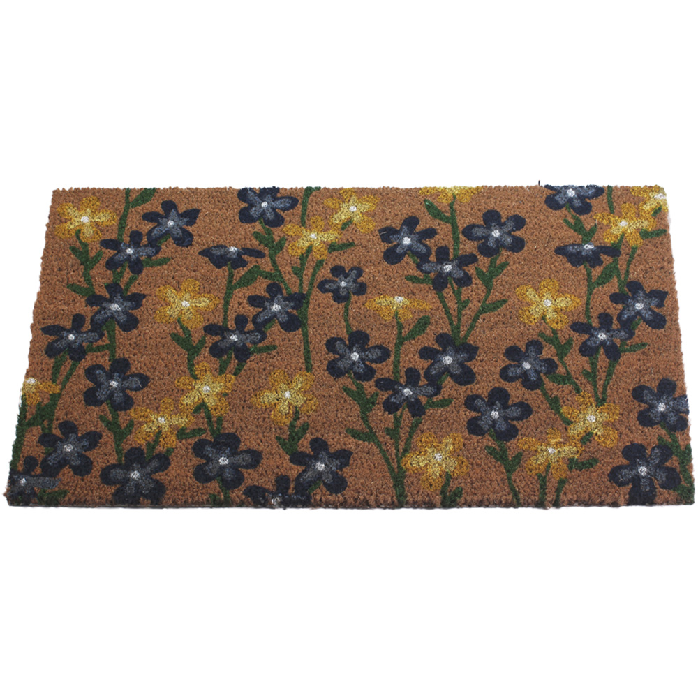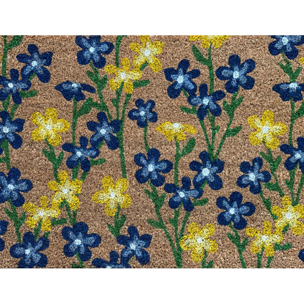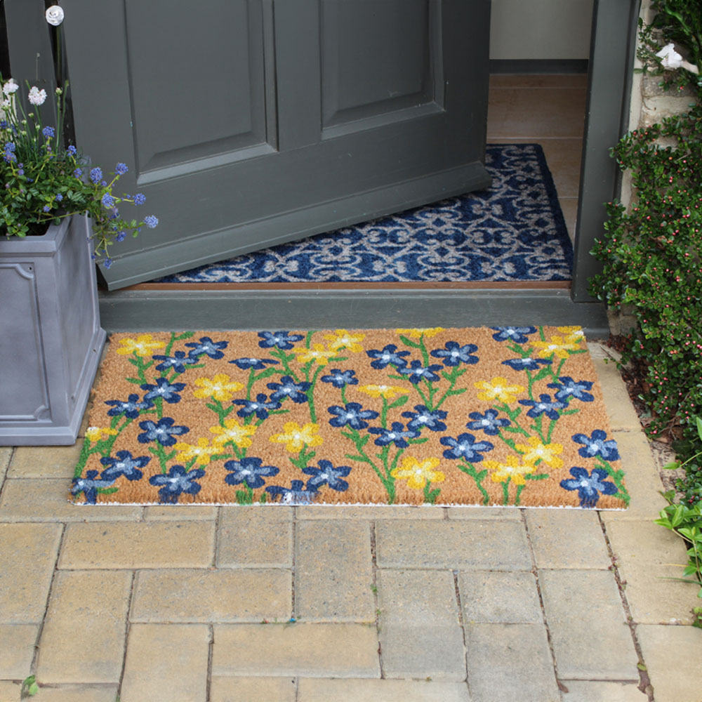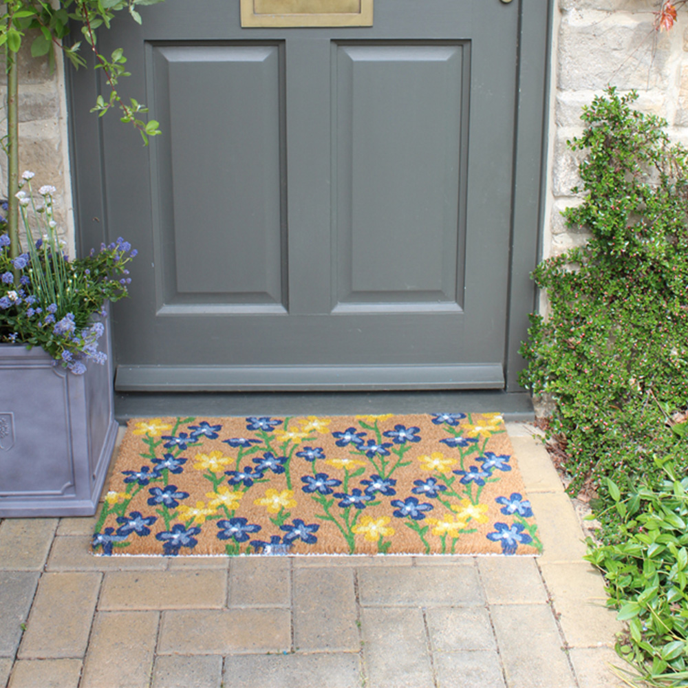 Greet your guests with vibrant colours with an RHS Spring Flowers Latex Backed Door Mat 45 x 75cm. This beautiful doormat welcomes your guests with a pop of colour and a touch of artistry. This charming coir doormat is hand-printed with vibrant blue and yellow spring blossoms. It takes its cue from the beautiful watercolours by Caroline Maria Applebee, part of the RHS Lindley Collections.