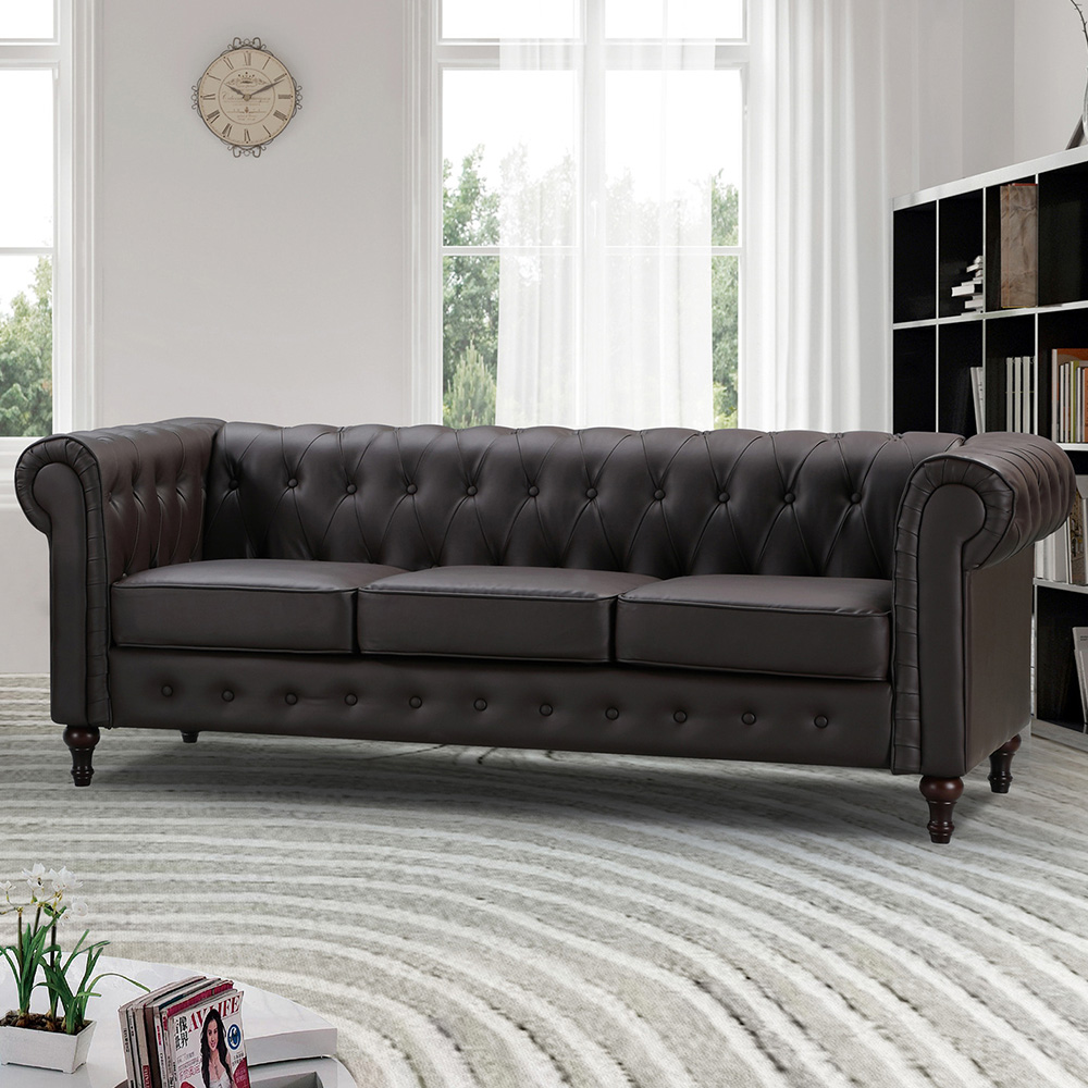 Upgrade your home or office space with Richland 3 Seater Brown Leather Sofa. This stylish Chesterfield-type sofa is perfect for both home and office use. The suite is constructed from a solid, hardwood frame with a sprung and foam-filled interior and is upholstered in durable bonded leather with some faux leather used on the lower-stress areas. This is a 'sofa in a box' type model and arrives unassembled - perfect for bringing through narrow doors and corridors. Do not worry about the assembly of the product, as this will be carried out free of charge by the white glove delivery team.
