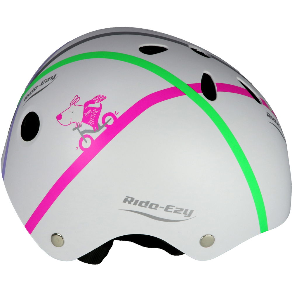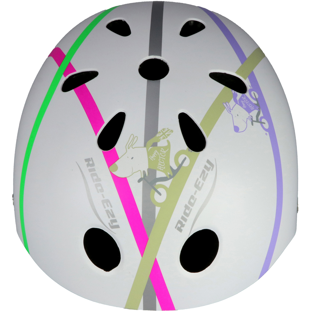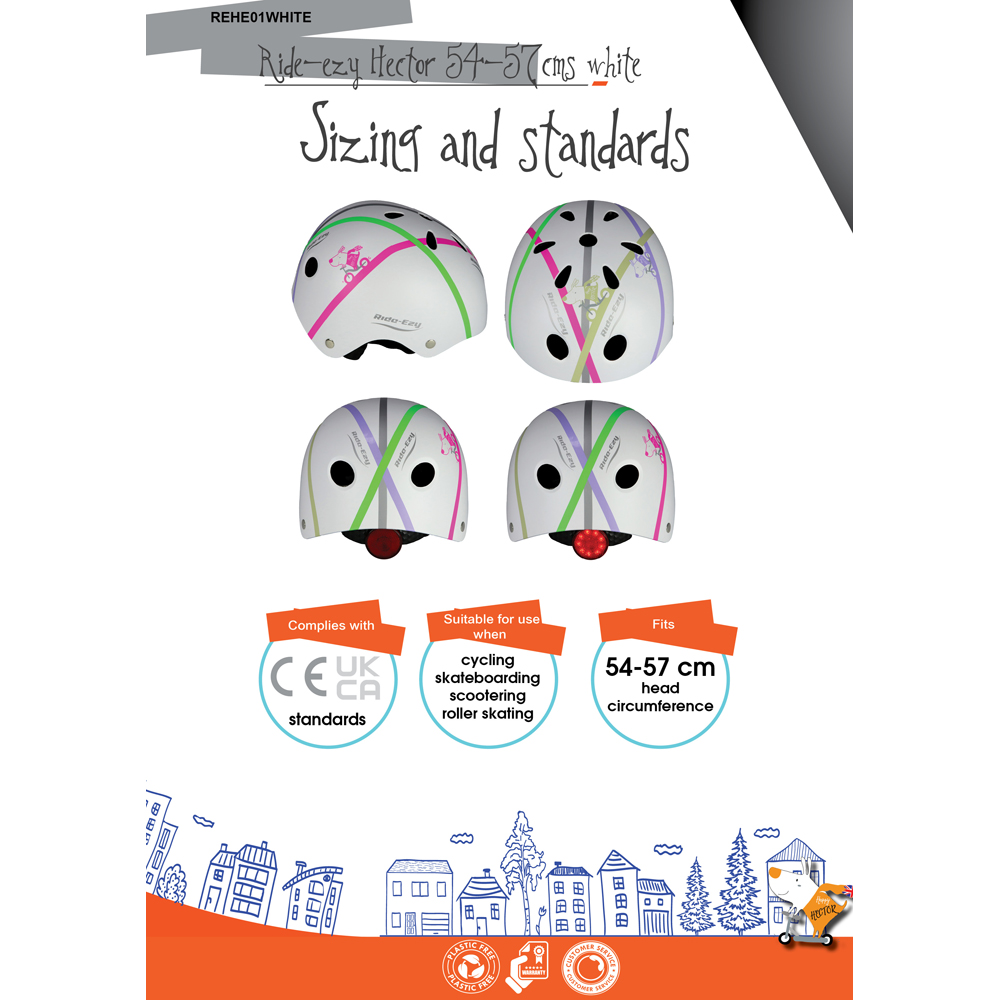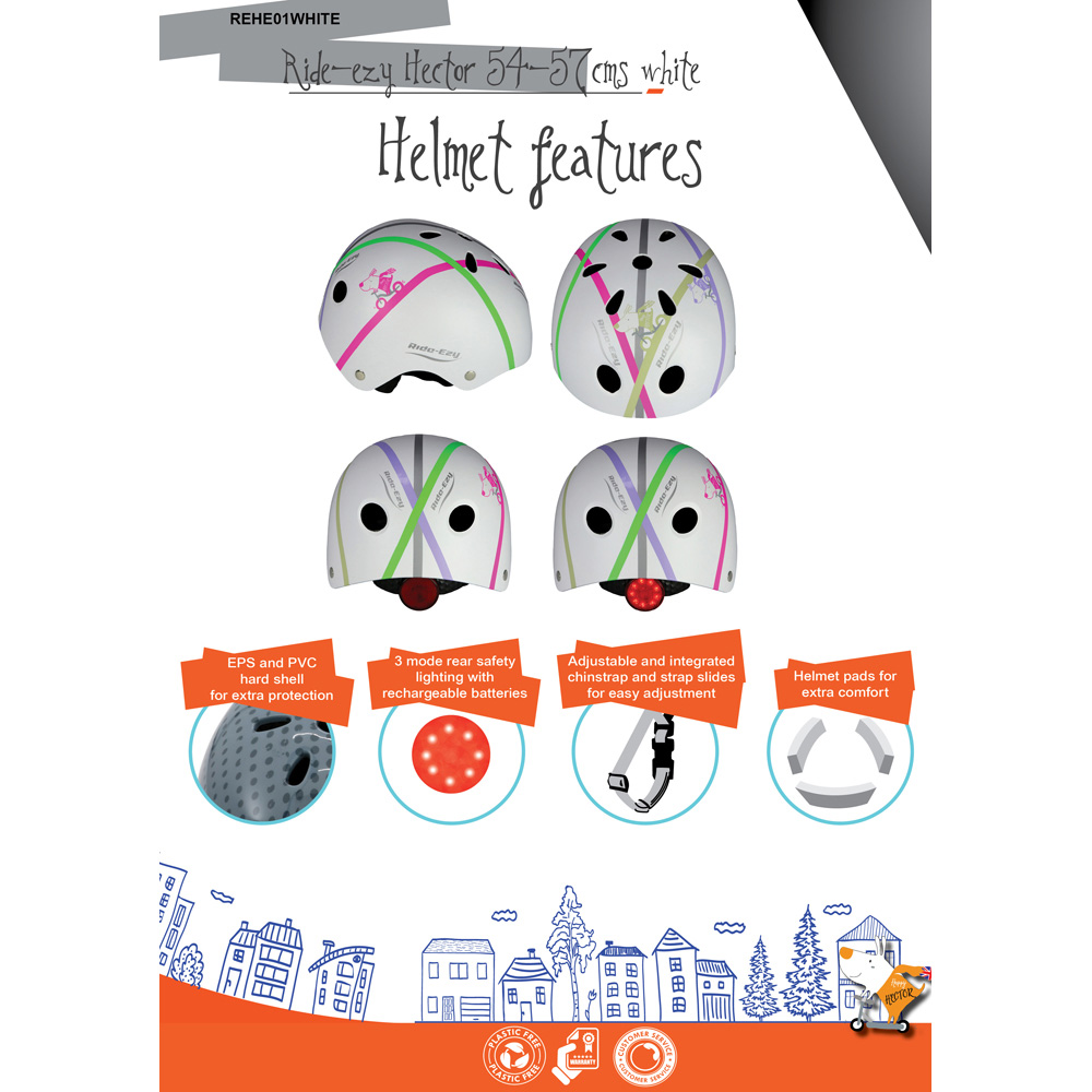 The Ride-ezy Hector helmet made from EPS & PVC is super comfy, super safe and super cool looking and certified for use with scooter, kids bikes and skateboards. Dimensions: 48-53cm.
