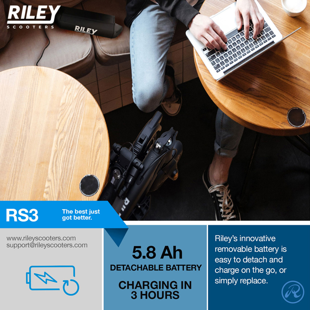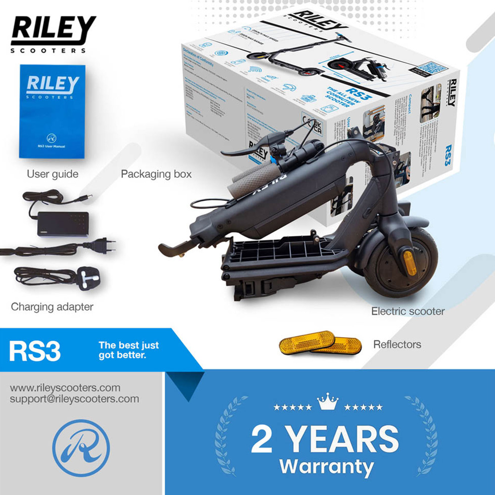 The RS3 by Riley Scooters is designed to be the most sturdy and powerful of electric scooters, and thanks to its folding deck (patent pending), a reinforced foldable handlebar chassis, one of the most portable, the RS3 scooter folds to 64.9 x 27.2 x 47.4cm (0.084m3) which makes it perfect for commuters to take on public transport and for storage for when space is at a premium. The Riley RS3 includes our proprietary brushless powertrain technology with a 700W peak, gets you there quicker with unbeatable performance and quality you expect. It is equipped with a long-range removable 37-volt 5.8ah battery pack which fits in your backpack that can be replaced in less than 20 seconds and charged in a matter of approximately three hours. It has a maximum speed of 15.5mph and a range of 15.5 miles and features three drive modes – Eco, conform and performance together with three-separate braking systems – a disc brake, E- ABS and a pedal brake, wide 8.5 inch pneumatic tyres, and an LED headlight and taillight system – that help you to stay seen whatever the conditions. It also has an LED screen showing your speed, speed setting and how much charge is left in the battery and a 115mm distance between the ground and the footplate. Unfolded dimensions 131.1 x 17 x 118.1 cm. Suitable for ages 16 years and above. Maximum rider weight is 120kg.