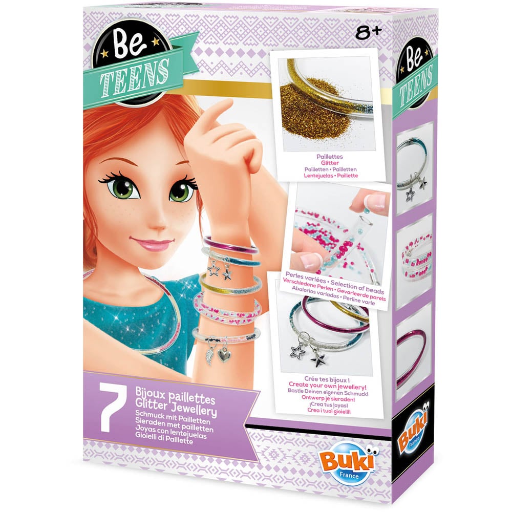 Embrace your inner designer with Robbie Toys Be Teens Glitter Jewellery. Choose your beads and glitter, mix the colours, and fill the transparent tubes to transform them into seven pieces of glittery jewellery. It includes a 20-page full-colour booklet for full instructions and ideas. Perfect for children aged eight years and above.