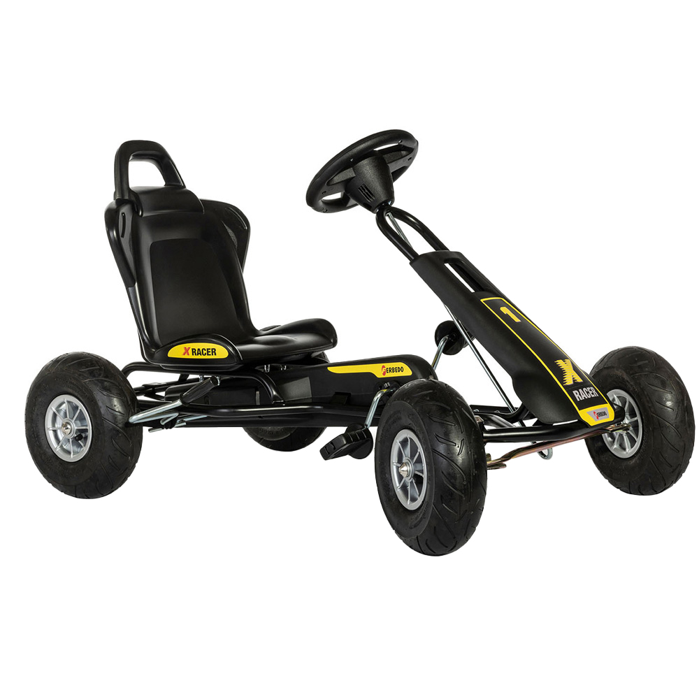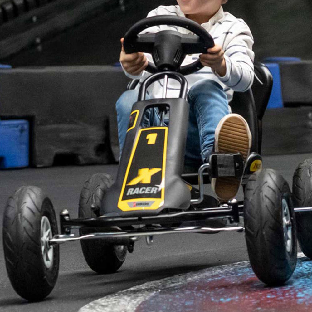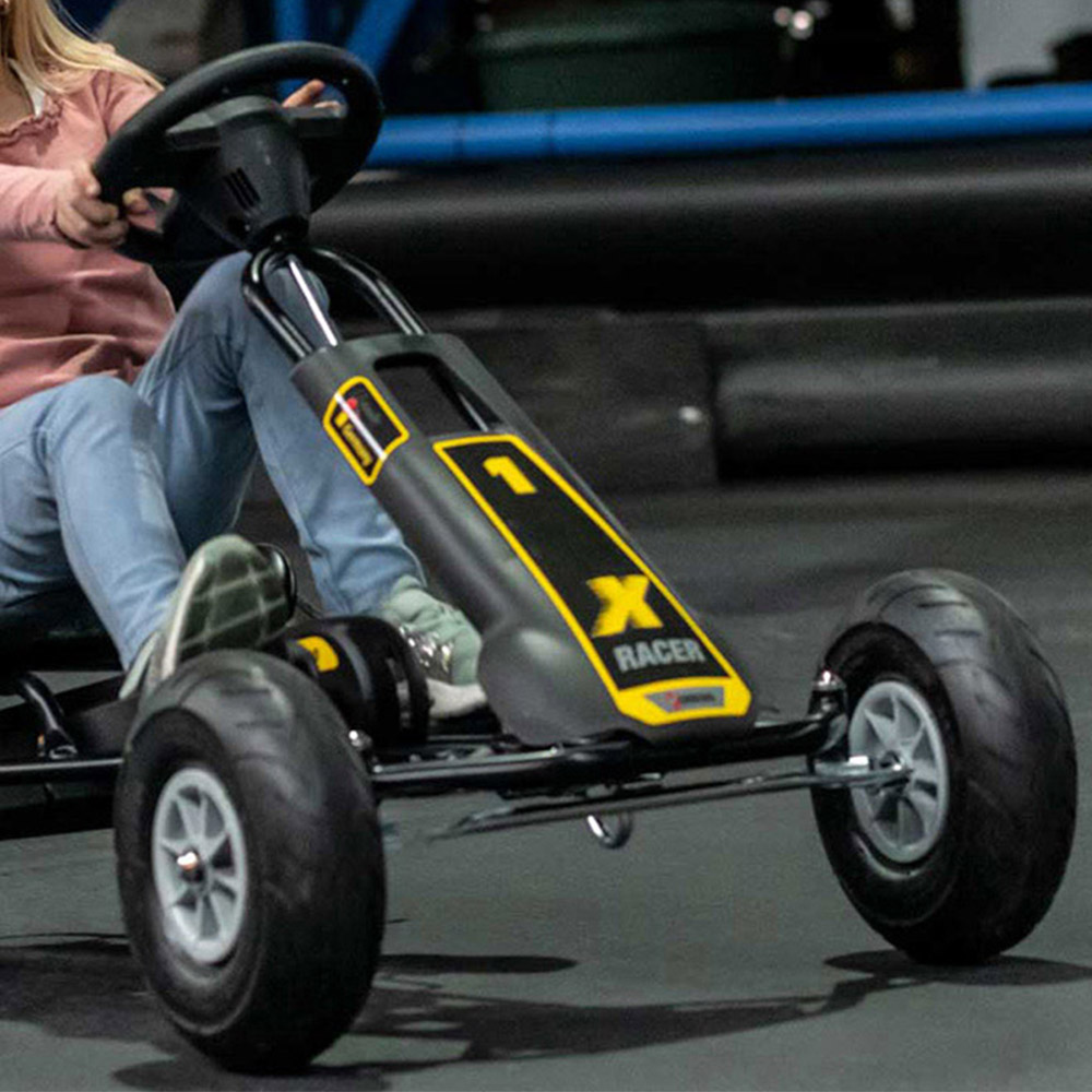 Made in Germany, this sturdy Robbie Toys AT X-Racer Go Kart in black has a robust, high-quality black steel frame. It features an automatic freewheel system with all-terrain pneumatic tyres, for a perfect fun driving experience. It also has an ergonomic, adjustable racing-style seat, a multi-sound steering wheel with thumb recesses, a large robust black plastic fairing and a handbrake. Requires three AAA batteries, not supplied. Maximum rider weight 50kg. Suitable for ages from three to eight years. Dimensions: 102 x 60 x 64cm.