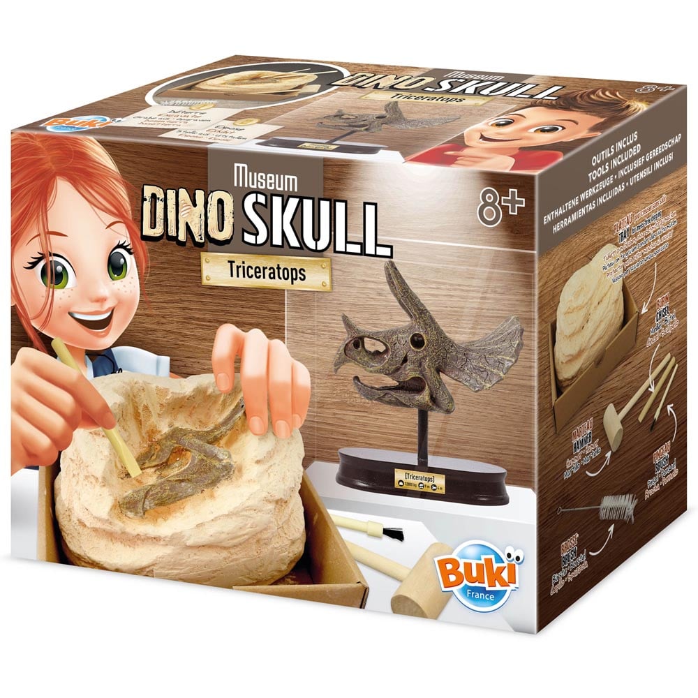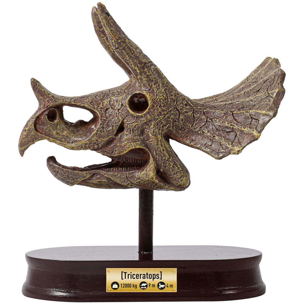 Unearth endless fun with this Robbie Toys Museum Dinosaur Skull Triceratops. Features a Triceratops skull with tools, which include a hammer, chisel, two brushes, a display plinth and post, a sponge, and a tray for mess-free digging. Exhibit the skull on the plinth, like in a museum. A fully illustrated colour booklet with instructions that maps the journey of dinosaur bones from discovery to the museum is also included. Suitable for ages eight and above.