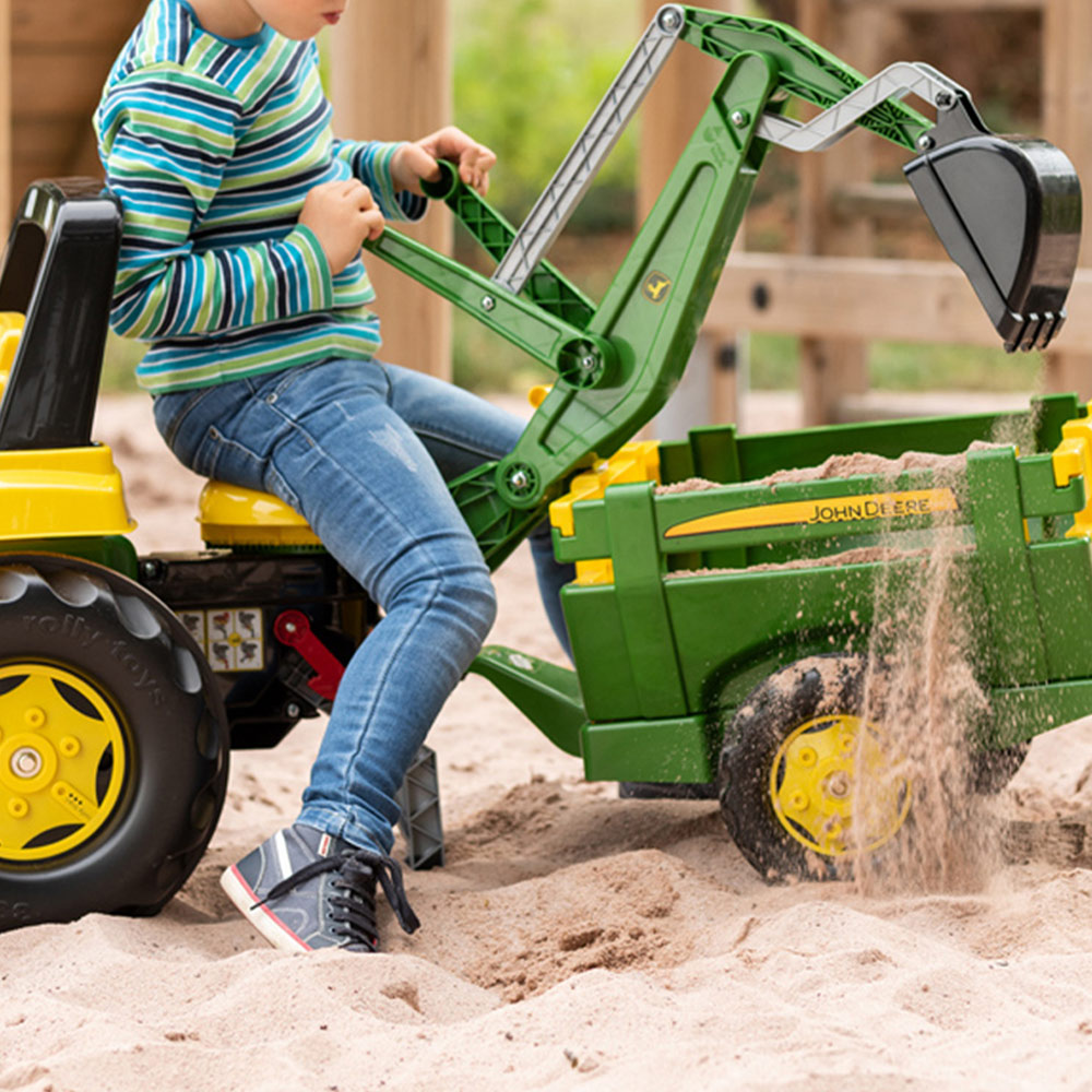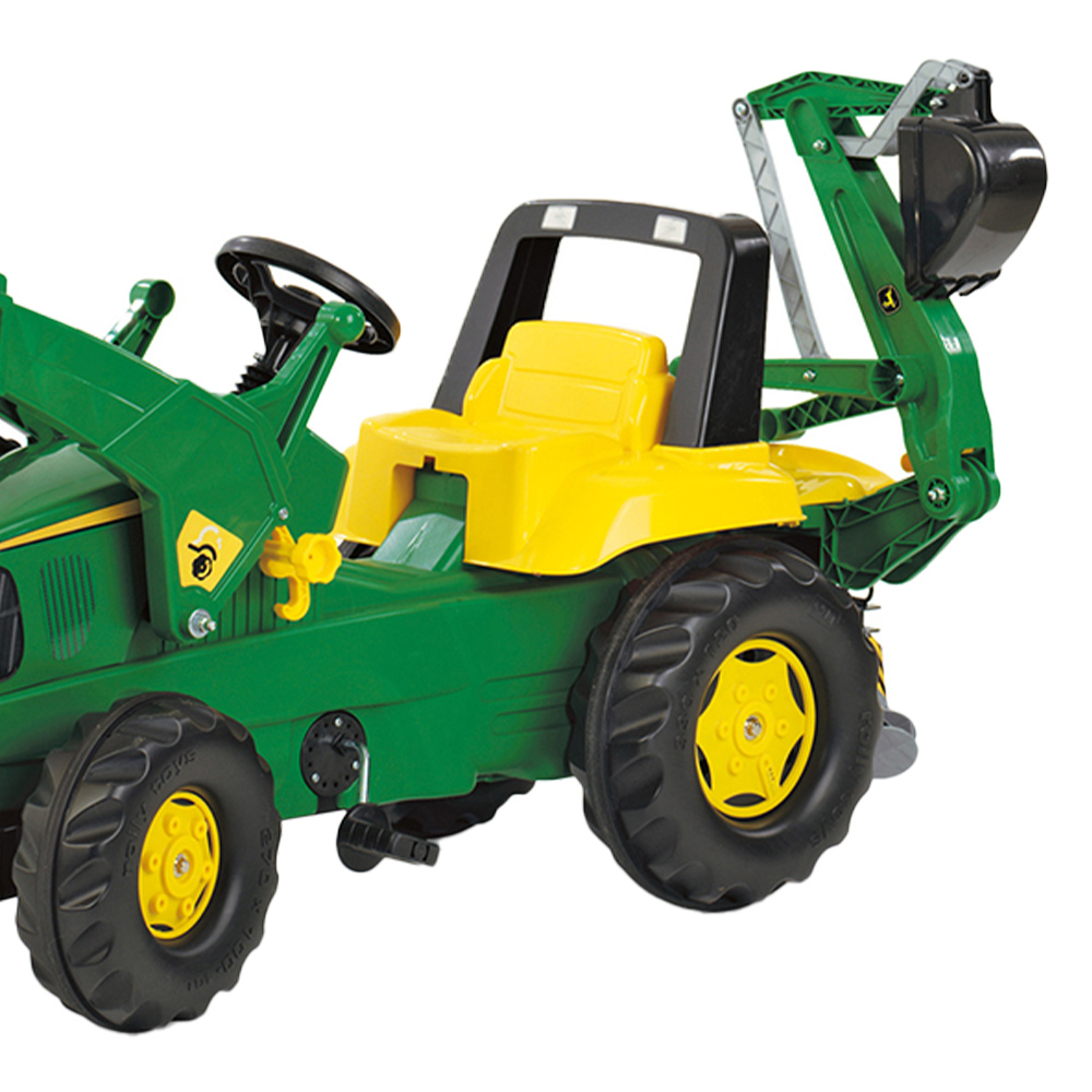 Keep your child busy for hours with this Robbie Toys John Deere Green and Yellow Tractor with Frontloader and Excavator. This large tractor features an adjustable seat, anti-slip pedals, all-terrain wheels, a front hitch pin, an opening bonnet and a large front loader that can be released, scooped and tipped. Apart from this, the rear excavator has its seat, imitation hydraulic foot and two levers that operate the excavating bucket - which imitates exactly the action of a real excavator. This tractor can also be ridden with the rear excavator tucked back in its inoperative position. Ideal for ages 3 to 8 years. Size: 164.5 x 53 x 76 cm.