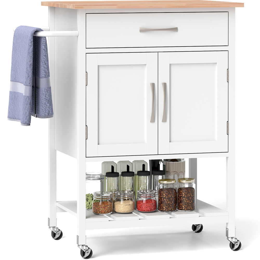 Maximise your kitchen's functionality with the Costway White 2 Door Single Drawer Rolling Kitchen Island Cart. It is a versatile addition that combines ample storage and mobility. Boasting a robust rubberwood countertop, it's perfect for meal prep or serving drinks. This cart features a drawer for utensils, a two-door cabinet for larger kitchen items, and a lower tray for dishes and spices. A metal bar allows for convenient towel hanging. With four smooth-rolling casters, two of which are lockable, you can easily move this cart between rooms or secure it in place, enhancing both its utility and stability.