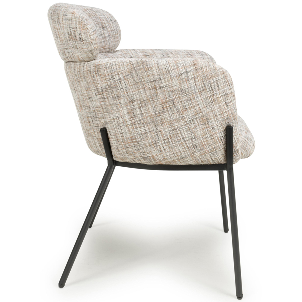 This understated contemporary accent chair comes in a stunning multi-tonal textured woven fabric. The generous bucket seat provides extreme comfort and is complemented by high armrests. A cylindrical headrest cushion adds an extra layer of comfort. The seat is supported by a distinctive, slim and angular black metal leg frame. Assembly required.