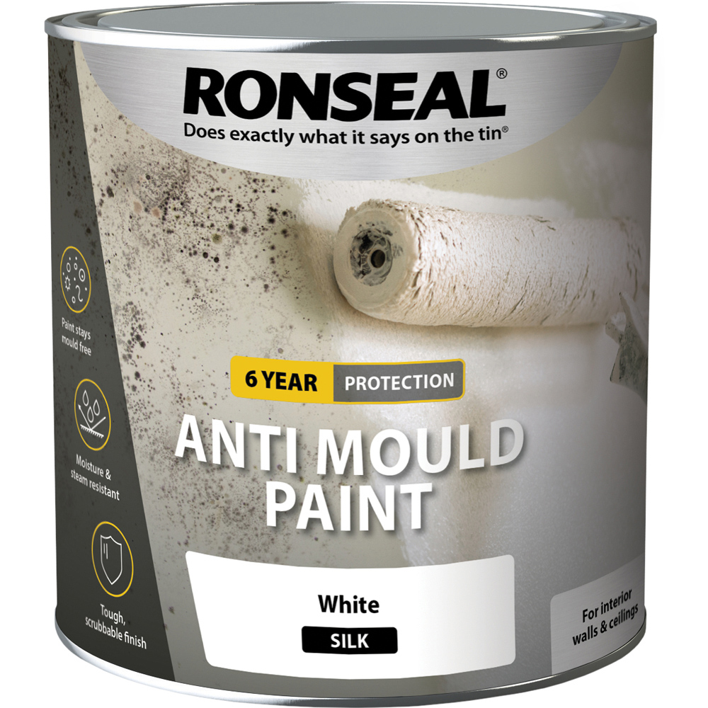 Ronseal Anti Mould Paint resists moisture and steam and stops common mould growing on your walls or ceilings for up to six years. It’s ideal for kitchens, bathrooms, cellars and anywhere else that attracts mould. This product covers 12 m²/litre, needs 2 coats, can be applied with a brush or roller, is dry to touch in 2 hours and if needed can be recoated in 2 hours. To prepare newly plastered walls, leave them to dry out for seven days. Then seal the plaster before using Anti Mould Paint. To prepare previously painted walls, if you already have mould, use mould killer to get rid of it. Don’t try and sand the mould off the wall otherwise you risk spreading the spores. Sand off any flaking paint so you have a smooth surface ready for painting. Thoroughly stir the paint so the consistency is smooth. Pour the contents of the tin into a tray and coat your brush or roller. Wipe off any excess on the rim of the tray. Apply the first coat. Wait four hours for it to dry. Apply the second coat. Wait four hours for it to dry. If you can still see colour through the paint, apply more coats until the colour is no longer visible. Once you have applied the last coat, wait 24 hours before letting condensation build up in the room again.