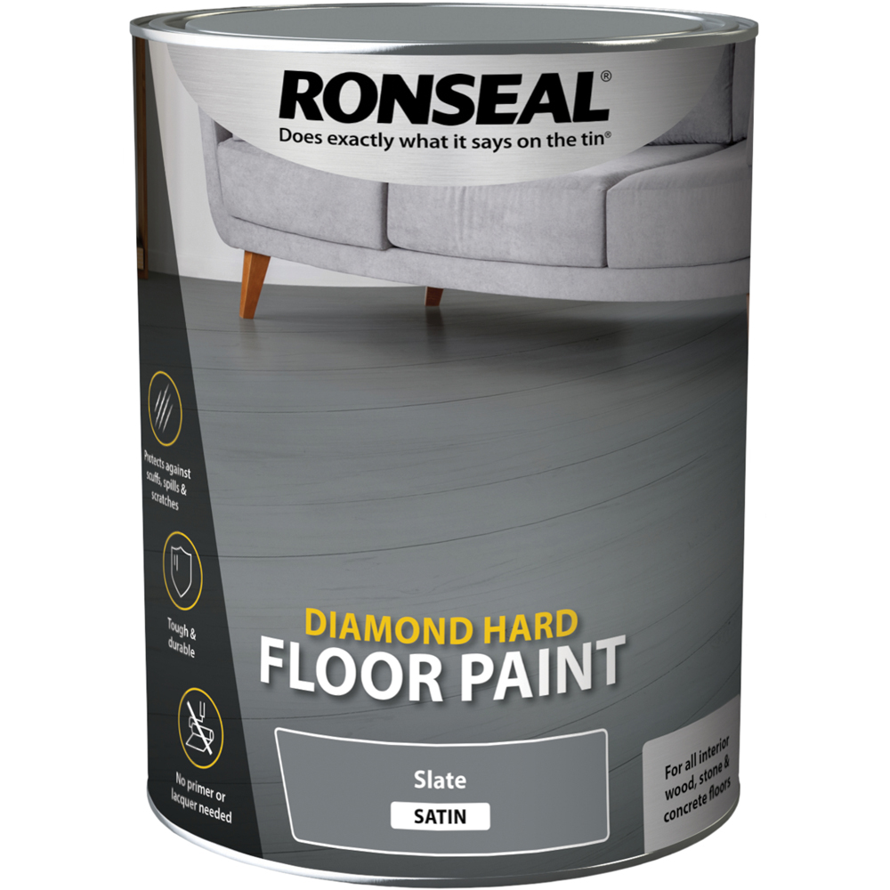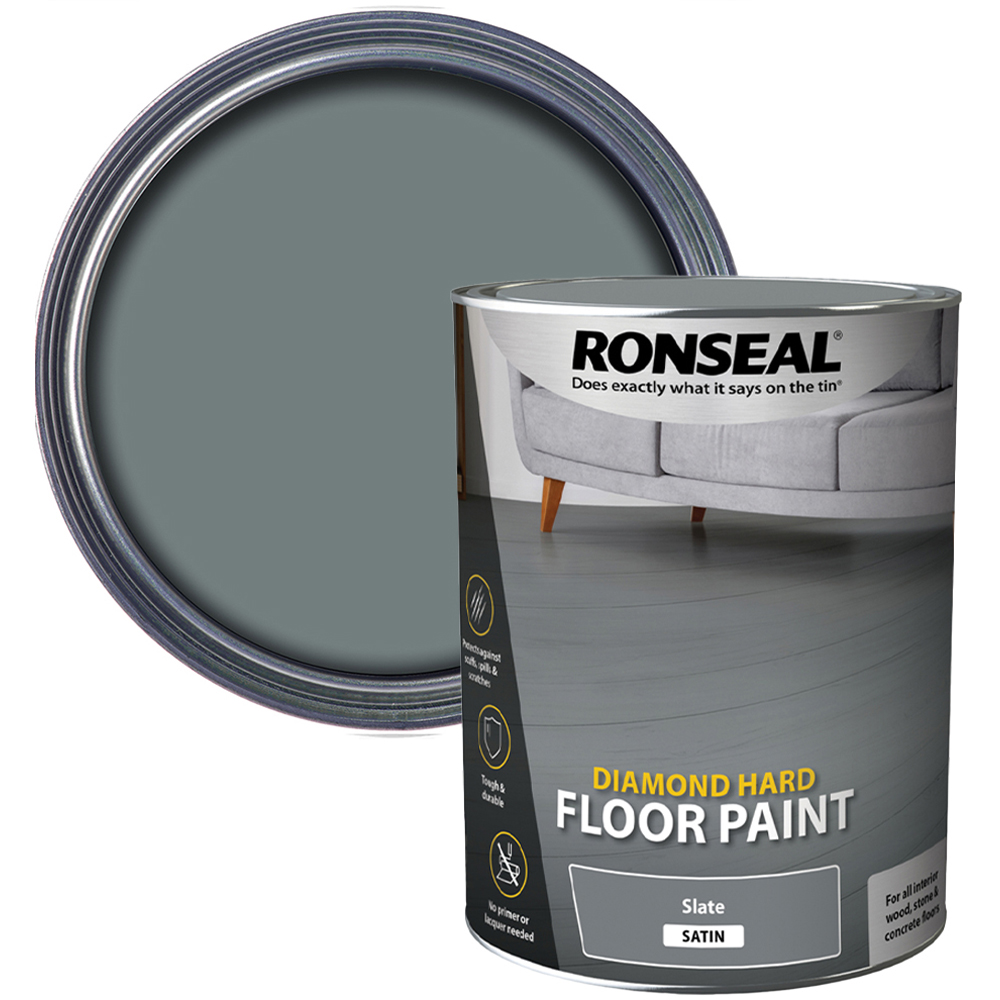 Ronseal Diamond Hard Floor Paint is tough, protecting from knocks, scuffs, scrapes and spills. Use it on wood, concrete and stone floors. This product covers 12 m²/litre, needs 3 coats, can be applied with a brush, is dry to touch in 4 hours and if needed can be recoated in 4 hours. When preparing concrete and stone floors, if they're bare make sure newly laid concrete has been left out to dry for a month before painting it. Wire brush the floor and remove any dust. Concrete floors can react with the paint and cause it to crack and blister so seal the floor with a stabilizing solution. Or it can be diluted with 10% water, then put onto the floor with a brush or roller. Leave to dry before painting over. For previously painted concrete, wire brush the floor, then wipe with white spirit and leave to dry before painting. When preparing wooden floors when bare, start by sanding the floor, this will give the wood an even finish. The easiest way to do this is with a floor sander. Use 120 grit sandpaper and go along the length of the boards. Make sure you wear a face mask and let the dust settle. Then vacuum and wipe down with white spirit. If you notice any holes or imperfections fill them in with Ronseal Multi-Purpose Wood Filler. Seal any knots with our Knot Block Wood Primer and Undercoat. If the floor is previously painted, sand down, then wipe with white spirit and leave to dry before painting. The colour in the tin will look different at first so you need to stir it thoroughly to mix the pigments. Test it on a small patch of your floor and leave it to dry. The colour should now be as expected so make sure you’re happy with it. You can use a brush, roller or our Perfect Finish Pad to apply the paint. Start painting in the corner that’s furthest from the door. If you’re painting wooden floorboards, focus on two or three at a time to avoid overlap marks and paint in the same direction as the grain. Make sure you don’t paint yourself into a corner. Wait four to six hours for the first coat to dry before adding another. For the best results, apply three coats. After four to six hours you’ll be able to walk across your floor and carefully move your furniture back in. After 72 hours, your floors will be able to resist knocks, scuffs and scratches without chipping, flaking or peeling.