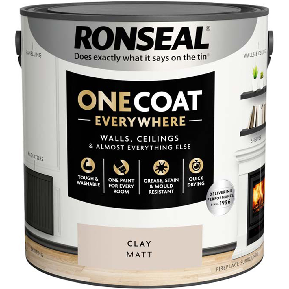 Ronseal One Coat Everywhere paint makes decorating your whole home easier and quicker. It'll give rich colour and tough protection to walls, ceilings and pretty much anything else you want to paint. It's stain resistant and washable, ready to stand up to the challenges of every day life. This product covers 25 m²/litre, needs 1 coat, can be applied with a brush or roller, is dry to touch in 1 hour and if needed can be recoated in 1 hour. For previously painted walls: Sand off any loose or flaking paint. Then give the walls a wipe with a damp cloth. If painting over a very bold or contrasting colour, use a basecoat first. Or you may need to put on an extra coat. For bare plaster: If you've had your walls and ceilings re-plastered, let it dry for 7 days before painting. You'll then need to seal the plaster. Use a basecoat or a plaster sealer for this. For bare & previously painted wood: Give the wood a light sand with 120 grit sandpaper, then wipe away the dust with a damp cloth. Fill any holes and cracks and treat any knots. For bare and painted metal: Sand of any loose and flaking paint, then wipe away the dust with a damp cloth. *If you're painting ferrous metals, like steel or cast iron, you'll need to use a specialist metal primer first. Give your paint a good stir. If you've got more than one tine of the same colour, mix them together. This'll ensure the colour is consistent. Get lots of paint on your roller or brush. Always work from dry to wet areas. Don't spread the paint too thin. Extra coats may be needed when trying to cover bold or contrasting colours. It'll be touch dry in 1 hour. If the second coat is needed wait 2-4 hours. Do not thin this paint.