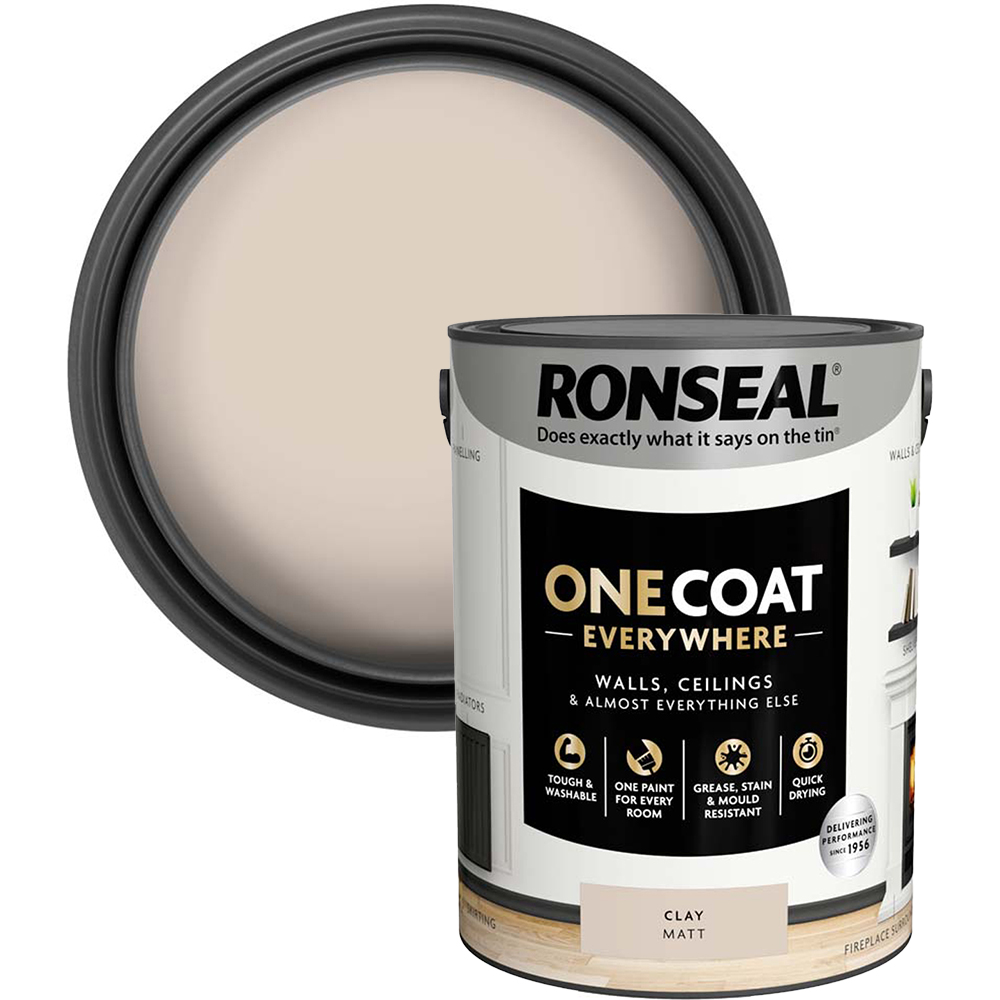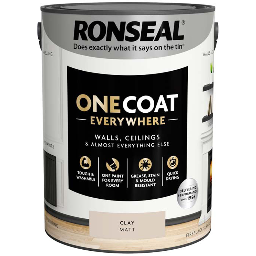 Ronseal One Coat Everywhere paint makes decorating your whole home easier and quicker. It'll give rich colour and tough protection to walls, ceilings and pretty much anything else you want to paint. It's stain resistant and washable, ready to stand up to the challenges of every day life. This product covers 25 m²/litre, needs 1 coat, can be applied with a brush or roller, is dry to touch in 1 hour and if needed can be recoated in 1 hour. For previously painted walls: Sand off any loose or flaking paint. Then give the walls a wipe with a damp cloth. If painting over a very bold or contrasting colour, use a basecoat first. Or you may need to put on an extra coat. For bare plaster: If you've had your walls and ceilings re-plastered, let it dry for 7 days before painting. You'll then need to seal the plaster. Use a basecoat or a plaster sealer for this. For bare & previously painted wood: Give the wood a light sand with 120 grit sandpaper, then wipe away the dust with a damp cloth. Fill any holes and cracks and treat any knots. For bare and painted metal: Sand of any loose and flaking paint, then wipe away the dust with a damp cloth. *If you're painting ferrous metals, like steel or cast iron, you'll need to use a specialist metal primer first. Give your paint a good stir. If you've got more than one tine of the same colour, mix them together. This'll ensure the colour is consistent. Get lots of paint on your roller or brush. Always work from dry to wet areas. Don't spread the paint too thin. Extra coats may be needed when trying to cover bold or contrasting colours. It'll be touch dry in 1 hour. If the second coat is needed wait 2-4 hours. Do not thin this paint.