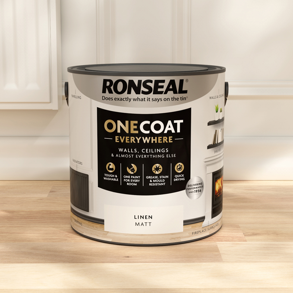 Ronseal One Coat Everywhere paint makes decorating your whole home easier and quicker. It'll give rich colour and tough protection to walls, ceilings and pretty much anything else you want to paint. It's stain resistant and washable, ready to stand up to the challenges of every day life. This product covers 25 m²/litre, needs 1 coat, can be applied with a brush or roller, is dry to touch in 1 hour and if needed can be recoated in 1 hour. For previously painted walls: Sand off any loose or flaking paint. Then give the walls a wipe with a damp cloth. If painting over a very bold or contrasting colour, use a basecoat first. Or you may need to put on an extra coat. For bare plaster: If you've had your walls and ceilings re-plastered, let it dry for 7 days before painting. You'll then need to seal the plaster. Use a basecoat or a plaster sealer for this. For bare & previously painted wood: Give the wood a light sand with 120 grit sandpaper, then wipe away the dust with a damp cloth. Fill any holes and cracks and treat any knots. For bare and painted metal: Sand of any loose and flaking paint, then wipe away the dust with a damp cloth. *If you're painting ferrous metals, like steel or cast iron, you'll need to use a specialist metal primer first. Give your paint a good stir. If you've got more than one tine of the same colour, mix them together. This'll ensure the colour is consistent. Get lots of paint on your roller or brush. Always work from dry to wet areas. Don't spread the paint too thin. Extra coats may be needed when trying to cover bold or contrasting colours. It'll be touch dry in 1 hour. If the second coat is needed wait 2-4 hours. Do not thin this paint.