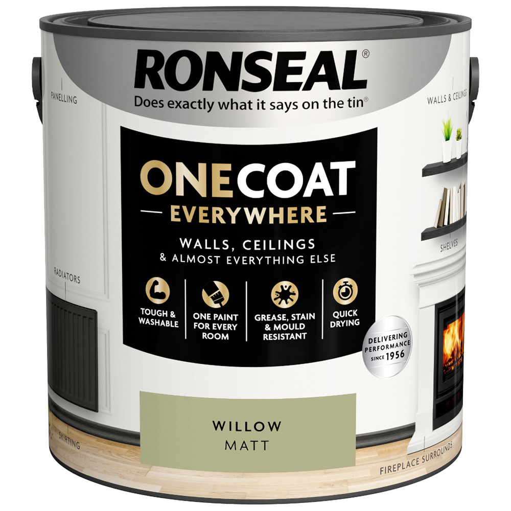 Ronseal One Coat Everywhere paint makes decorating your whole home easier and quicker. It'll give rich colour and tough protection to walls, ceilings and pretty much anything else you want to paint. It's stain resistant and washable, ready to stand up to the challenges of every day life. This product covers 25 m²/litre, needs 1 coat, can be applied with a brush or roller, is dry to touch in 1 hour and if needed can be recoated in 1 hour. For previously painted walls: Sand off any loose or flaking paint. Then give the walls a wipe with a damp cloth. If painting over a very bold or contrasting colour, use a basecoat first. Or you may need to put on an extra coat. For bare plaster: If you've had your walls and ceilings re-plastered, let it dry for 7 days before painting. You'll then need to seal the plaster. Use a basecoat or a plaster sealer for this. For bare & previously painted wood: Give the wood a light sand with 120 grit sandpaper, then wipe away the dust with a damp cloth. Fill any holes and cracks and treat any knots. For bare and painted metal: Sand of any loose and flaking paint, then wipe away the dust with a damp cloth. *If you're painting ferrous metals, like steel or cast iron, you'll need to use a specialist metal primer first. Give your paint a good stir. If you've got more than one tine of the same colour, mix them together. This'll ensure the colour is consistent. Get lots of paint on your roller or brush. Always work from dry to wet areas. Don't spread the paint too thin. Extra coats may be needed when trying to cover bold or contrasting colours. It'll be touch dry in 1 hour. If the second coat is needed wait 2-4 hours. Do not thin this paint.