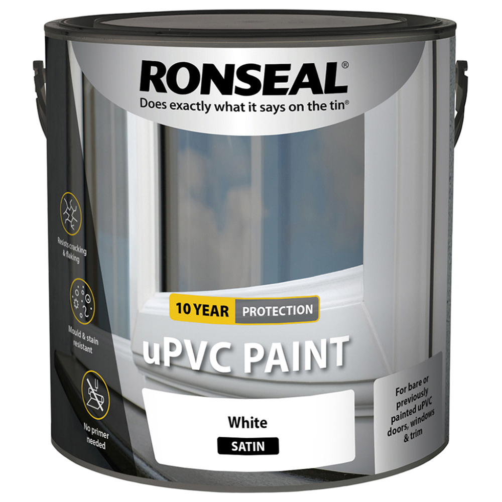 Ronseal uPVC Paint revamps your uPVC windows and doors with a long lasting, durable formula. Flexible to prevent cracking and mould resistant to minimize staining, this uPVC paint is ready to withstand whatever the weather throws at it. You can apply Ronseal uPVC Paint directly to the surface without the need of a primer and it'll be rain ready in 1 hour. This product covers 6.5 m²/litre, needs 2 to 3 coats, can be applied with a brush, roller or sprayer, is dry to touch in 1 hour and if needed can be recoated in 1 hour. When using Ronseal's uPVC Paint, wait for a warm dry day, above 10°C, and not likely to rain. Cold, wet weather can stop the paint from drying properly. Make sure the area you're painting is clean, dry and free from dirt, dust & grease. Wash the surface with warm soapy water, rinse and leave to dry thoroughly before painting. Then make sure the surface is smooth, any damaged areas will need repairing before painting. Lightly sand the area to give it an even finish. Use 180-220grit sandpaper to do this. If you're painting over previously painted uPVC and the paint is in good condition, just give it a light sand with 240grit sandpaper. If it’s flaking or cracked, you’ll need to sand it off. Use 120grit sandpaper. Remember to wear a face mask. Clean up any dust and wipe with a damp cloth. Give the paint a really good stir. Then paint it on with a brush or foam roller. Leave it to dry for 2-4 hours, then put your second coat on. If you’re painting over a dark colour you may need to put a third coat on. Your last coat will be waterproof in 1 hour.