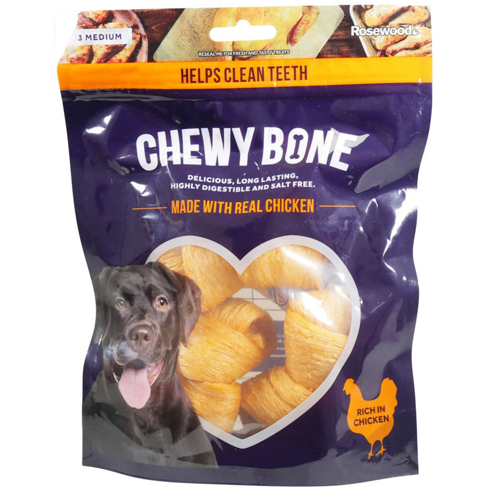 These Rosewood Chewy Bones are made with real chicken (15%) for a healthy dog treat your pet will love the taste of. This treat is not only delicious it's also long lasting, highly digestible being salt free, and it helps clean teeth.Pack includes three pieces.