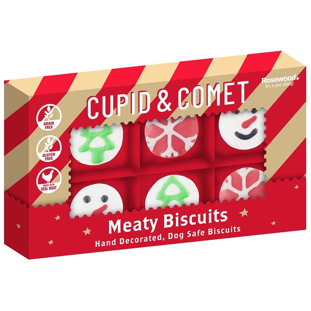 Treat your dog this Christmas with our Rosewood Cupid and Comet Meaty Biscuits, presented in a seasonal gift box! There are six delicious festive meaty treats in total which are all hand-decorated with dog-safe icing. Made with real meat, they're sure to get your pooch involved in the festivities and get their tail wagging!