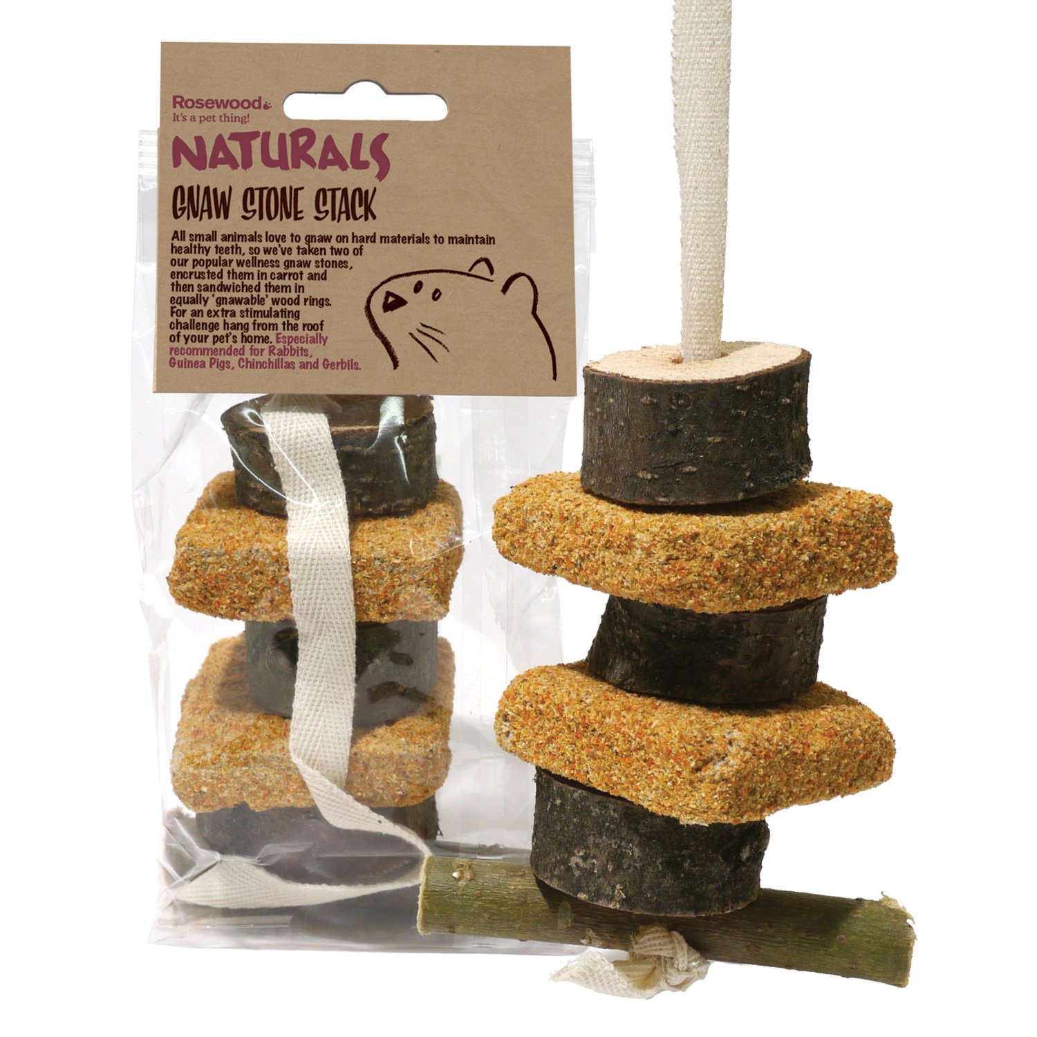 Give your furry little friend a tasty treat with this Rosewood Naturals Small Animal Gnaw Stone Stack. Made from edible wood and a special baked loam stones coated with dried carrots, your hamster, rat, mouse or gerbil will love gnawing away on this stick. Hang this treat around their cage to encourage investigating, exploring and natural foraging behaviour.