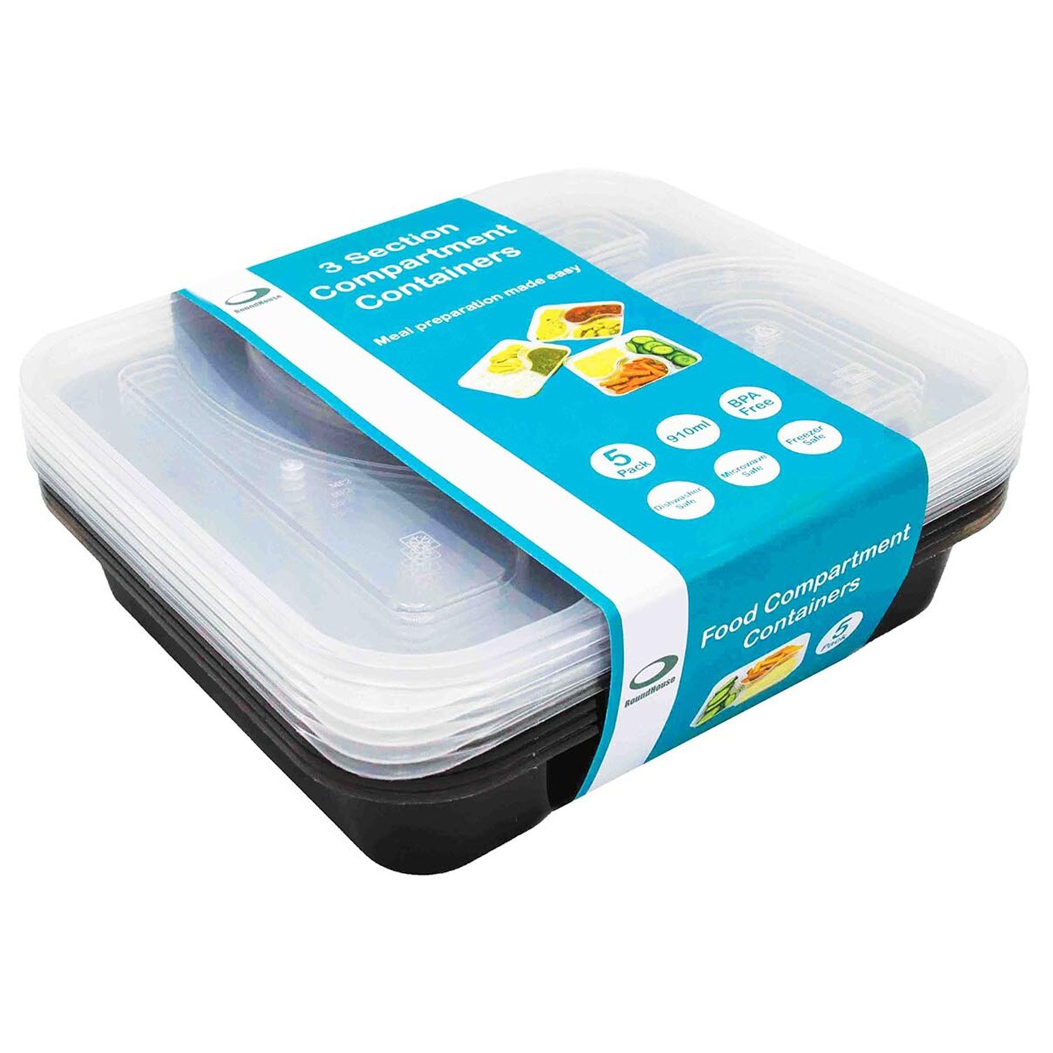 This Pack of 5 Compartment Containers is perfect for meal prep, food storage, and packed lunch box. The container has three compartments for all the components of your meal and is suitable for your dishwasher, microwave, and freezer for your convenience. The containers come with lids and are perfect for your kitchen cabinets.