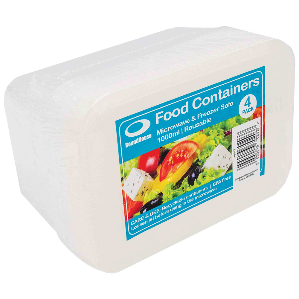 These RoundHouse Plastic Food Containers are perfect for reheating food in the microwave, storing leftover food or after batch cooking. Pack of four, these clear food containers come with a secure lid to prevent spillages. Easy to clean. It is BPA-free and made from recyclable plastic. Microwave, freezer and dishwasher safe, they'll make an essential addition to any kitchen. Capacity: 1000ml.