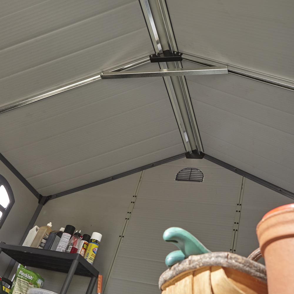 Keep your garden essentials dry and protected with the Rowlinson Airevale 8x6 Plastic Shed. The plastic shed is an attractive, durable and low-maintenance alternative to a traditional timber shed. It features lockable doors for security, gable vents for better air circulation, two side windows, and a UV-protected Polypropylene construction. Apart from a UV-treated polypropylene for extra strength the shed also comes with a 12mm twin-wall fluted panel construction. Perfect for storing your garden equipment, the eco-friendly shed is highly durable and made from 100% recycled plastic. Size: 8 x 6 feet.