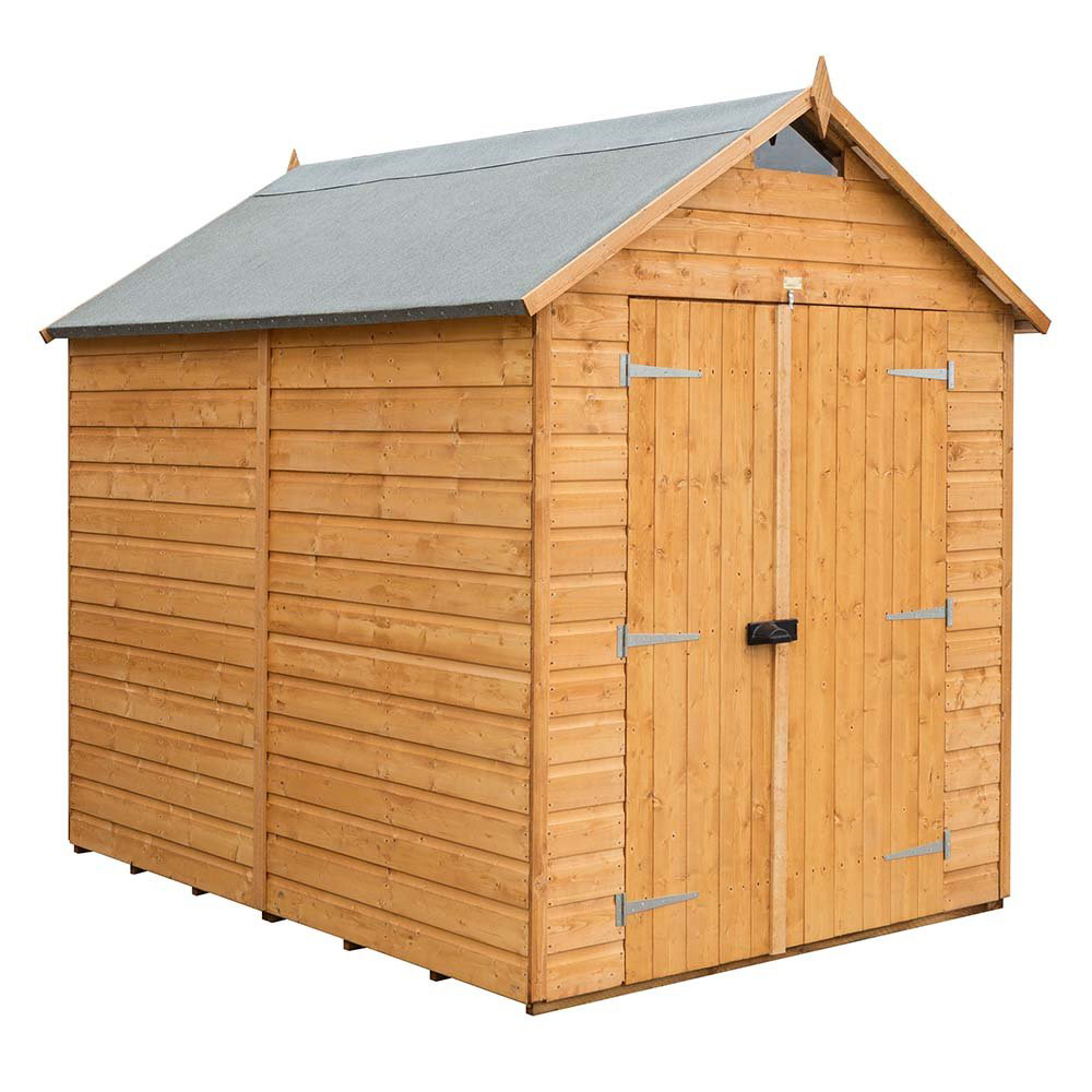 Keep all of your valuable tools and equipment safe, secure and hidden from sight with the Rowlinson Security Shed. Featuring a small apex window to let in light without the worry of people looking in, and a padlock protector for extra security. This sturdy shed with 12mm shiplap cladding has heavy-duty framing for increased durability and the double doors have security hinges so that you have additional peace of mind. Size: 8 x 6ft.