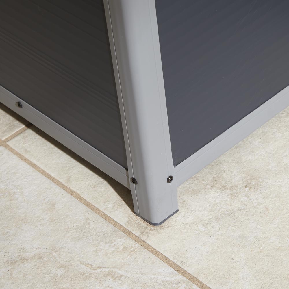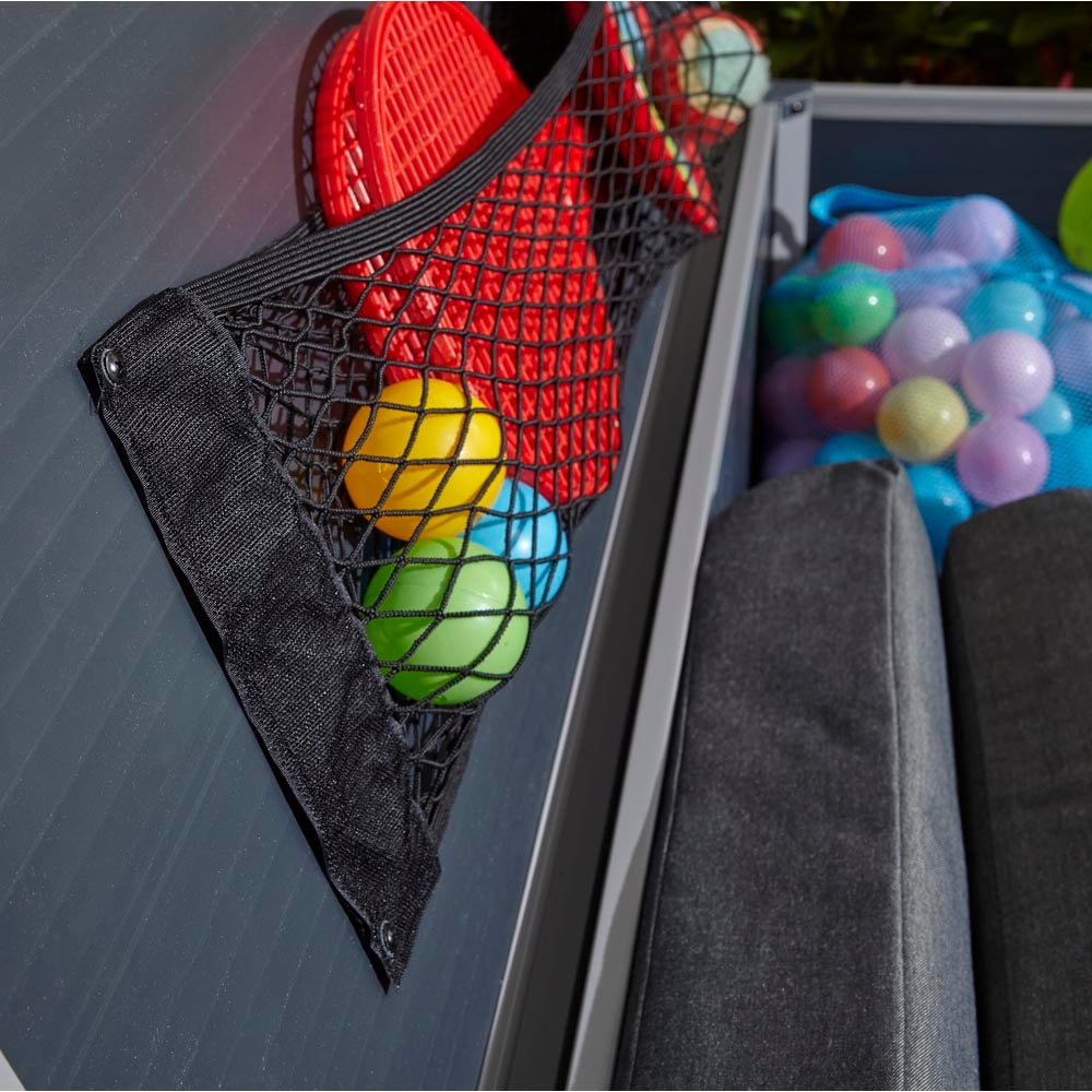 The Rowlinson Airevale 4x2 plastic cushion box is ideal for storing and protecting garden furniture cushions from any weather conditions. This plastic cushion box offers stylish, practical and durable garden storage. The Airevale cushion box features a lockable lid to provide easy access and additional security for your garden valuables. It has a large capacity of 342 Litres, features net storage for smaller items and requires little maintenance. It is perfect for all sizes of gardens. The Airevale plastic cushion box is supplied pre-painted in dark grey with light grey trim. The plastic box constructed from 100% recycled plastic is durable, low maintenance, long-lasting and environmentally friendly. 12mm twin-wall fluted panel construction. Internal dimensions: H540 x W1175 x D540 mm.