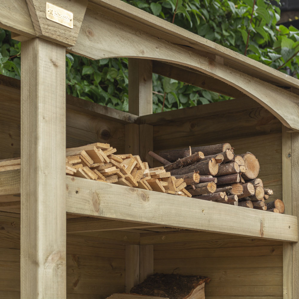 Store logs safely in the Rowlinson Double Timber Wood Premium Heritage Log Store. If you have a log burner, fire pit or chiminea, you will know the importance of using only kiln-dried or well-seasoned logs to ensure maximum burn efficiency. This elegantly designed log store with its arch fascia and fine sawn detailing, will not only make an impressive feature of your log storage, it will also keep logs in perfect condition ready for use when necessary. Also, the large storage capacity can easily hold a double row of logs up to 270mm long. The handy shelf can be positioned on either side and at any height within the store and is ideal for sticks and kindling. Plus, the heavy-duty timber construction is pressure-treated against rot for long-life protection against the elements. Capacity: 1400L.