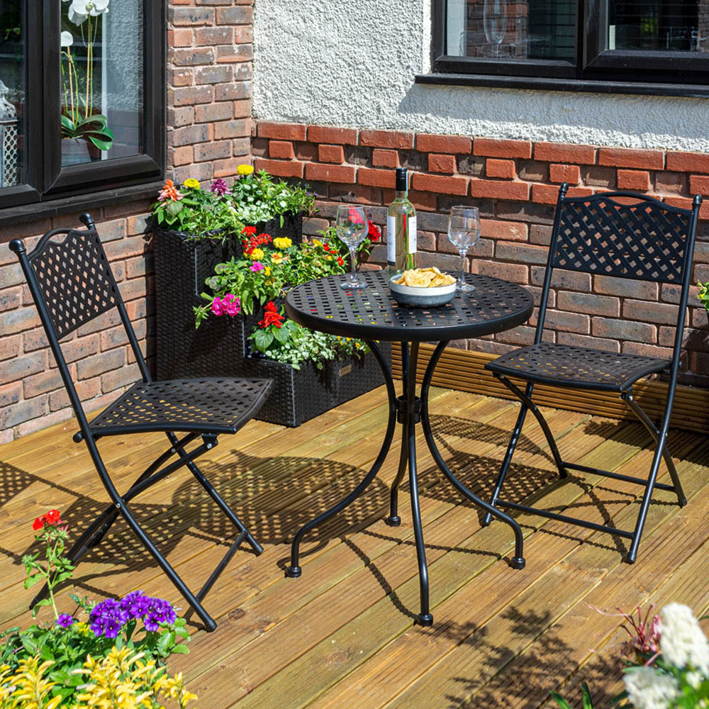 The Rowlinson Havana Bistro Set is an attractive outdoor bistro set with a traditional lattice design and a strong steel construction. With two folding chairs, the Havana is supplied with an stylish matt black powder coated frame.