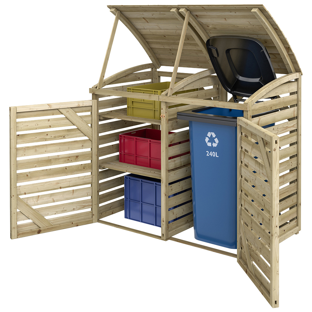 Keep your outdoor space neat with this Rowlinson Single Bin Store. It is the perfect way to hide a household wheelie bin, as well as your recycling boxes. Featuring lifting lids with chains that connect to the bin lids for easy access, as well as opening doors that allow for easy removal when due for collection. The Box storage section also features useful height-adjustable shelves, ensuring versatile storage. Supplied pressure treated to protect against rot, and in a natural timber finish that can be painted or stained in a style to suit your garden - transforming a usually unsightly garden essential. Dimensions: Overall: H130 x W156 x D82cm. Footprint: W156 x D82cm. Door opening: H107 x W71cm.