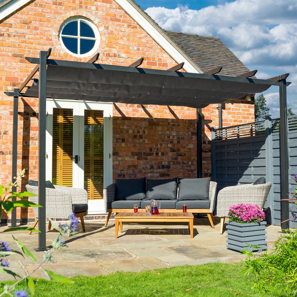 Enjoy the al fresco lifestyle with the Rowlinson Venetian Canopy. This grey canopy provides you with a perfect shaded place for ultimate relaxation. It is crafted using showerproof polyester fabric and features a detachable pully tool. It is removable and can be stored when not in use in the winter season. It is designed to provide shade rather than protection from the weather while you rest outdoors. This free-standing and retractable canopy is the perfect place for you and your guests to enjoy the sunny weather.