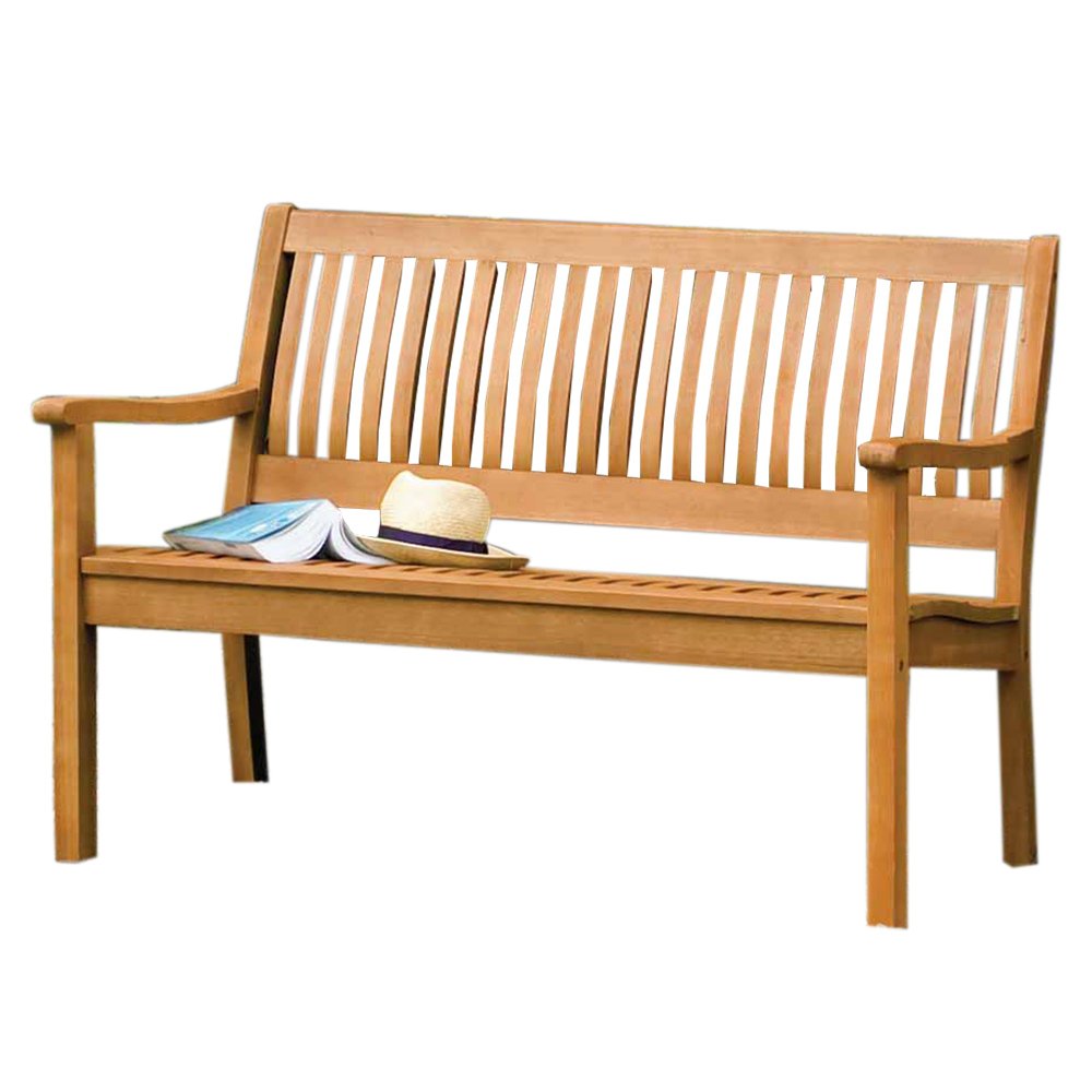 Great for your garden or patio, this traditional wood bench will not only look great in your outdoor space but will also last for years. Manufactured from eucalyptus, a hardwood renowned for its strength and stability, this bench is built to last. Eucalyptus hardwood construction is built to endure despite any harsh climate. The classic style with the slatted and dark brown stain finish, this timeless style will look great in your garden. Whether you are looking for seating in a sun-trap or just a spot to sit down and relax with family and friends, this bench comfortably seats two people and is designed for comfort with a shaped seat and backrest. The bench is ergonomically designed with a shaped seat and backrest and comfortable armrests so you can sit back and relax on this bench for any period of time. Easy self-assembly is required. Factory stain finish. Dimensions: H86.4 x W121.9 x D71.1cm. Guarantee: one year.