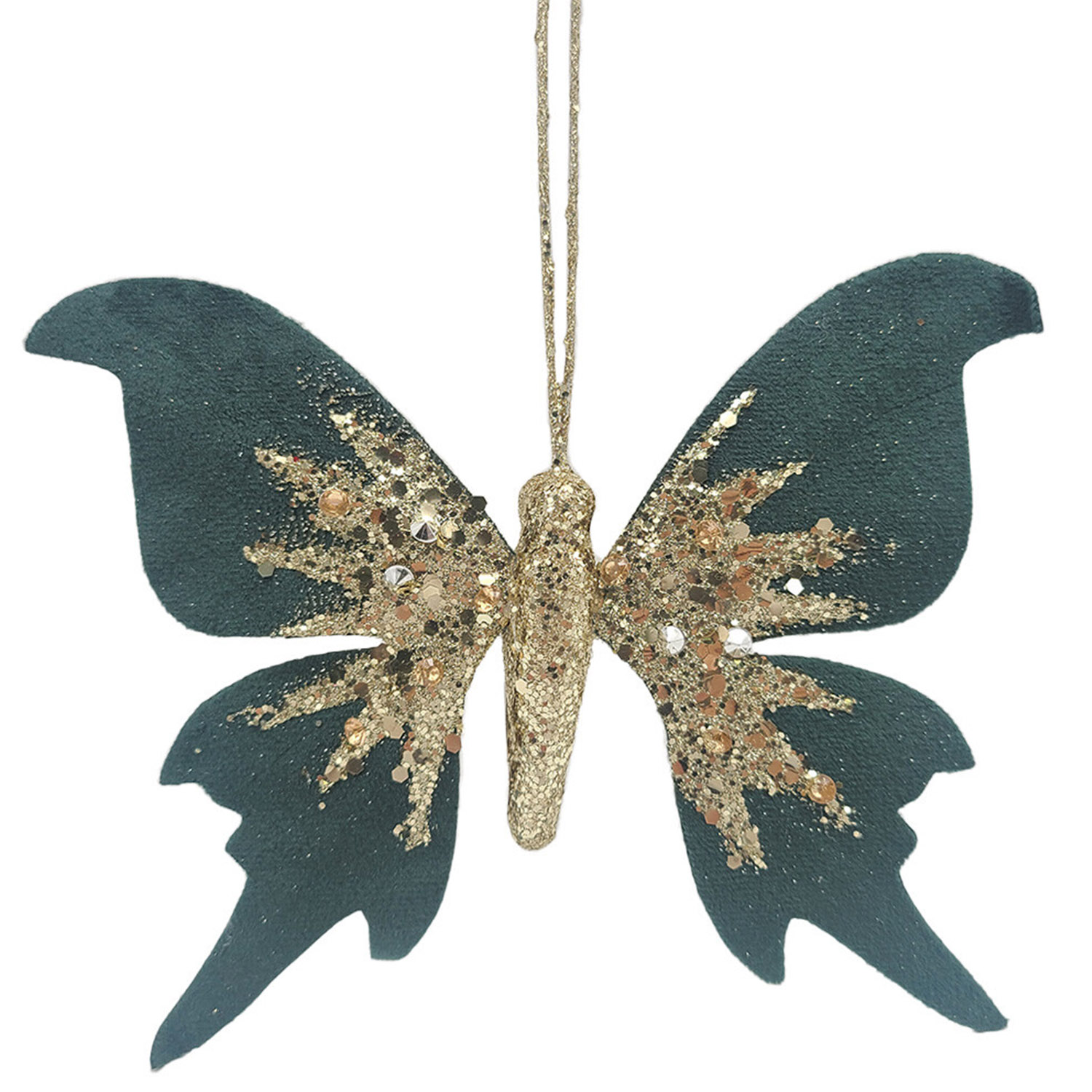 The Velvet Butterfly Ornament is an elegant addition to your Christmas tree this winter. The charming butterfly design is coloured with a rich emerald tone with gold glitter accents so it shimmers on your tree. It will give your Christmas decor a whimsical feel you'll want to recreate and use each year.