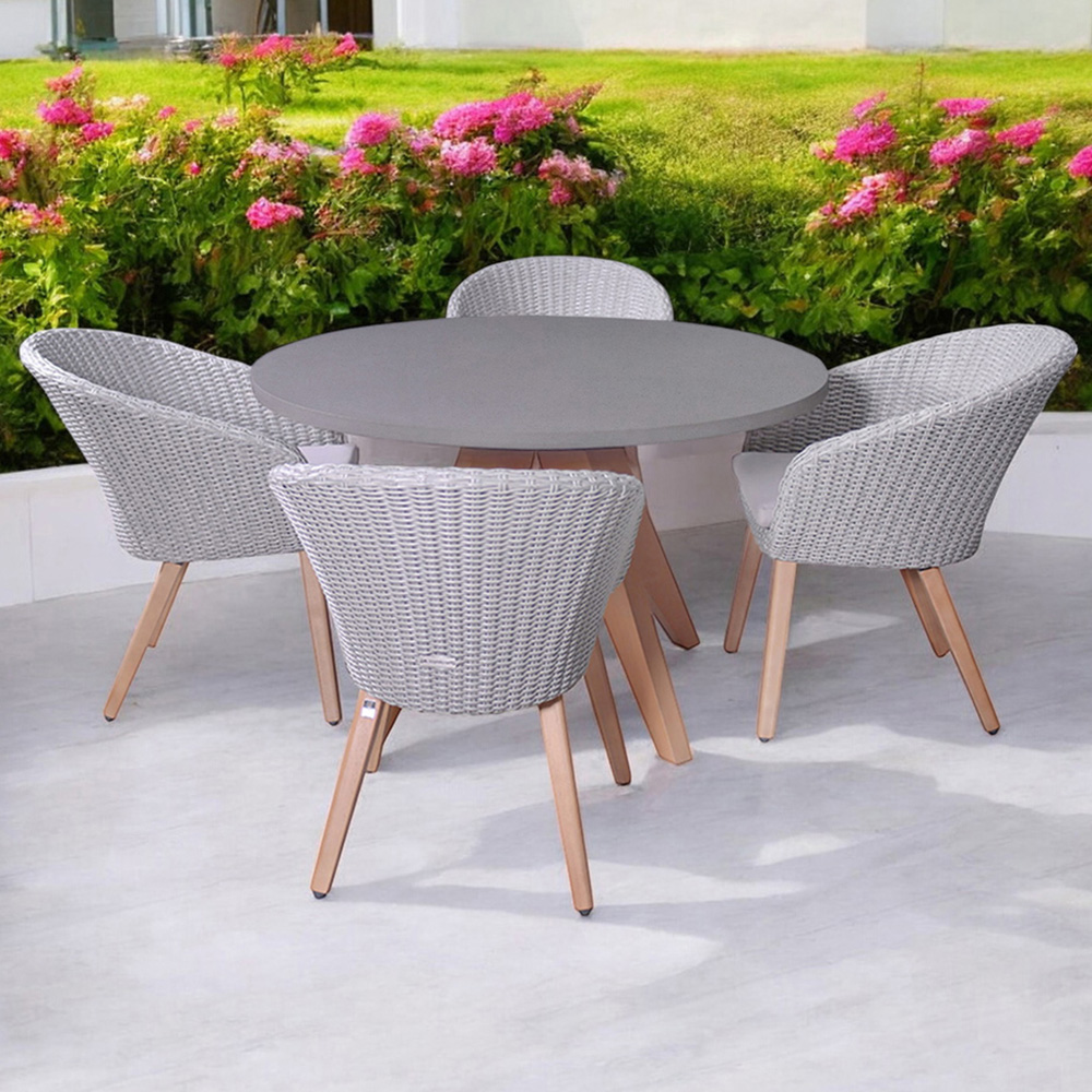 Elevate your outdoor dining experience with the Luna 4-Round Concrete Dining Set with Sol Rattan Dining Chairs. This set combines the robustness of lightweight concrete and the rustic charm of sustainably sourced Acacia hardwood. With a focus on environmental responsibility, the FSC-certified wood legs support beautifully crafted rattan chairs, making this dining set a testament to both style and sustainability. The 120cm round table is complemented by four Sol Rattan Dining Chairs, each wrapped in a synthetic rattan that enhances the contemporary design. Ideal for those extended periods of relaxation, the set includes luxurious 250gsm Polyspun fabric cushions, ensuring comfort without compromising on durability or aesthetics.