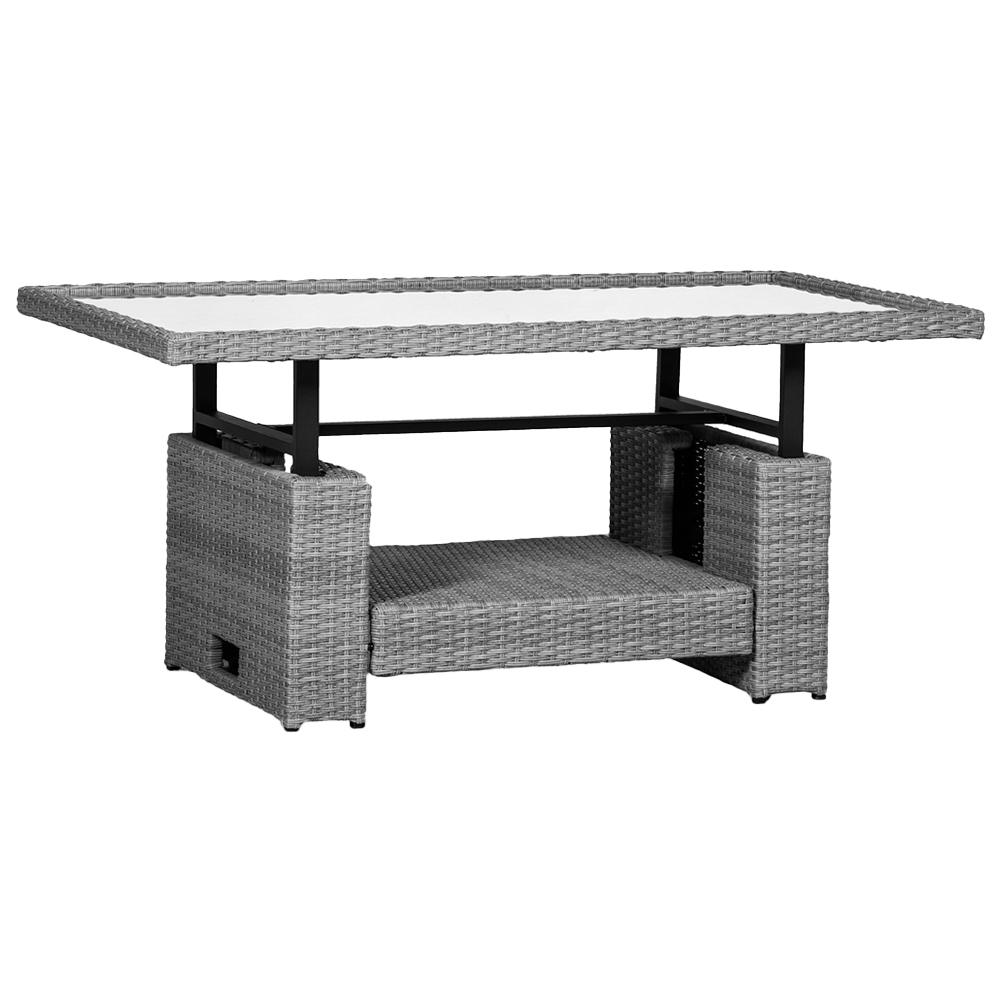 This Royalcraft Paris 7 Piece Adjustable Corner Dining Set offers the perfect setting for outdoor lunch or dining or to simply relax with a drink. It retains a classic style made using an aluminium framework and hand-woven, synthetic double half-round, rattan weave. It offers style, comfort, strength and durability. Consisting of a rectangular adjustable table, two sofas, a corner and middle chair and two footstools with all-weather shield cushions. Whether you are using this set to lounge with a coffee or to dine with friends, this set is a perfect choice. The adjustable table can be adjusted to suit your needs by lowering it to a coffee height or raising the table to turn it into a dining table. This corner dining suite is the perfect, practical family dining set. This set features our weather shield cushions which are stain-resistant and water-resistant. Protect your garden furniture with our durable and waterproof covers. Explore our wide range of heavy-duty Garden Furniture covers to find the perfect fit for your needs.