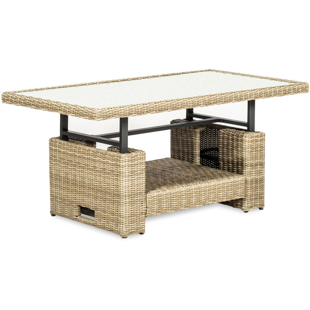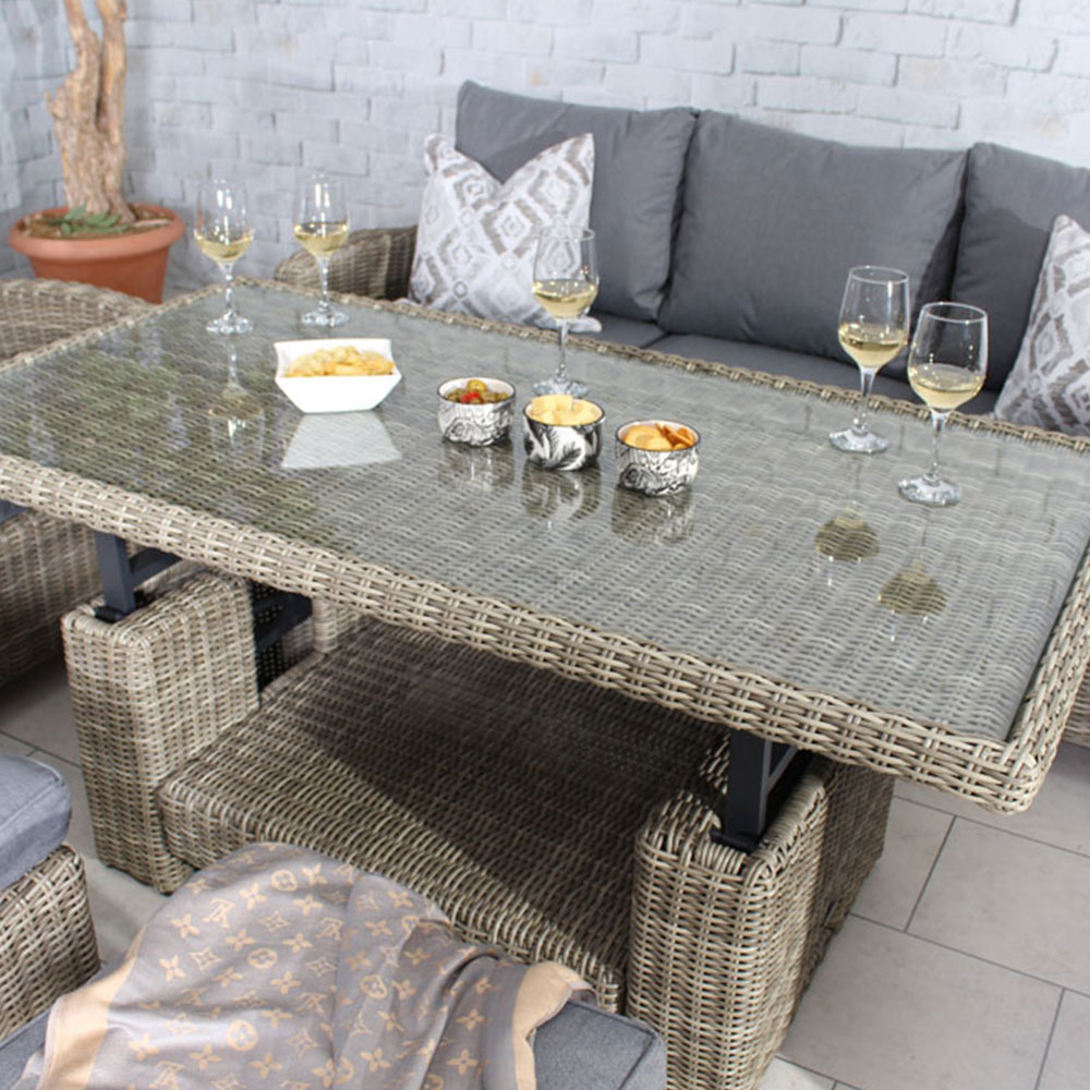 Relax in this deluxe and stylish Royalcraft Wentworth Rattan seven-seater sofa dining set. This Royalcraft Wentworth Rattan sofa set is perfect for formal dining or casual drinks to make the most of your garden, patio or conservatory space. The sofa dining set, retaining classic style with its aluminium framework construction and hand-woven, synthetic, half round weave Rattan, offers style, comfort, strength and durability. The sofa dining set consists of a rectangular adjustable table, three-seater sofa, two armchairs and two footstools, all with weather shield cushions. The aluminium framework is rustproof. The table is adjustable to suit your needs as a coffee or dining table, making this the ultimate luxury garden set. The dining set includes cushions that are resistant to shower and stain. This set will provide years of enjoyment and practical dining solutions. Protect your garden furniture with our durable and waterproof covers. Explore our wide range of heavy-duty