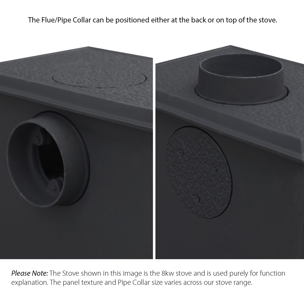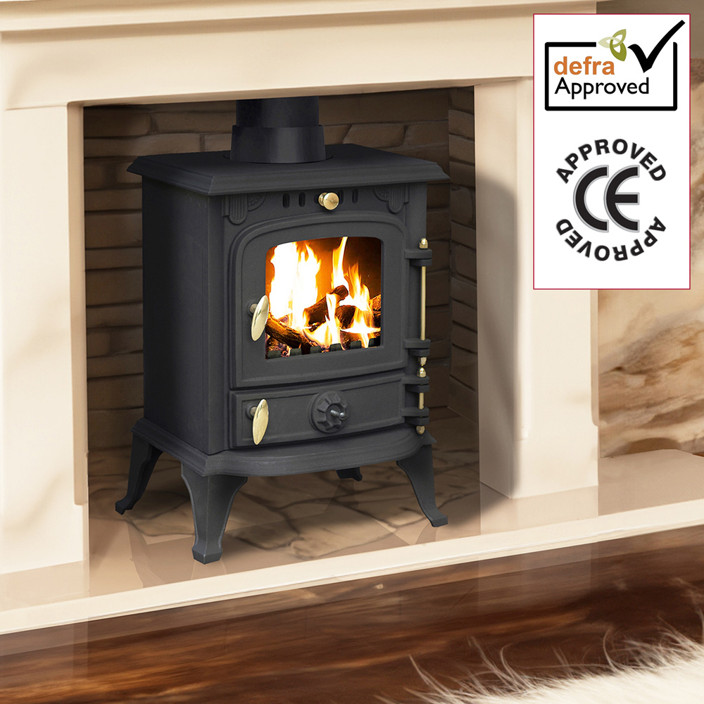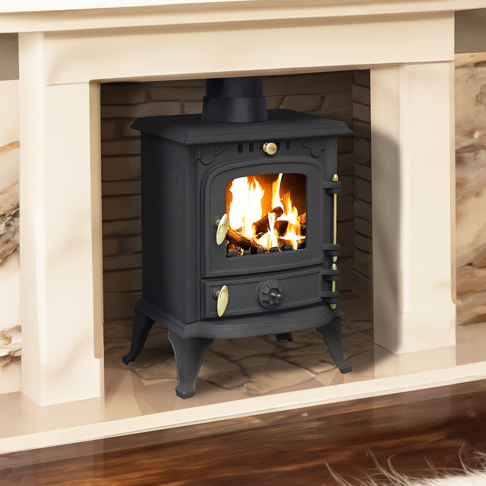 This DEFRA Approved Stove has a capacity of up to 4.5kW output and can be fuelled by multiple sources such as wood, charcoal and smokeless fuel. It comes complete with a solid cast iron body, brass handles, and a removable ash pan for ease and convenience. This multi-fuel stove also has the option of placing the flue at either the top of the stove or at the rear depending on your building layout and personal preferences. CAUTION: It is not recommended to burn coal in this stove, as it may damage the item and potentially cause a health risk. Width: 38cm, Length: 33cm, Height: 53cm. Weight: 48kg. Includes: baffle plate, five inch pipe collar, ash pan handle, one fire resistant glove. Back flue dimensions: From floor to start of hole: 34.5cm. From floor to centre of hole: 42cm. From floor to top of hole: 49.3cm. Top flue dimensions: From back to start of hole: 3cm. From back to centre of hole: 10.5cm. From back to end of hole: 18.2cm. Pipe collar dimensions: five inches. REF: 100685.